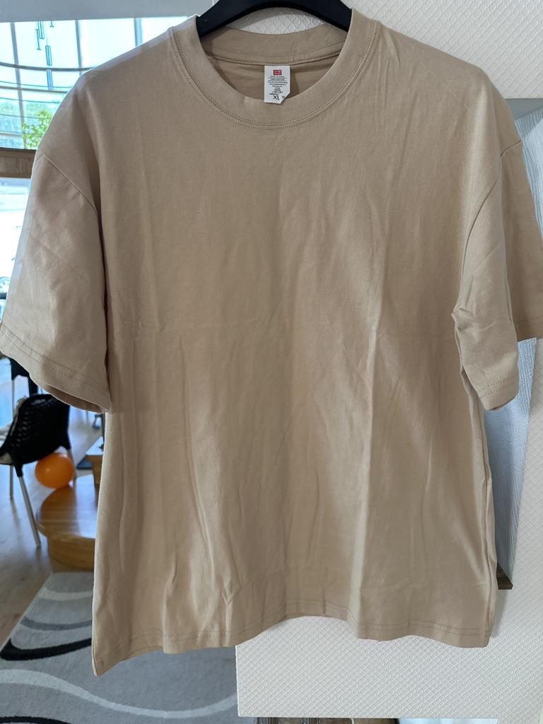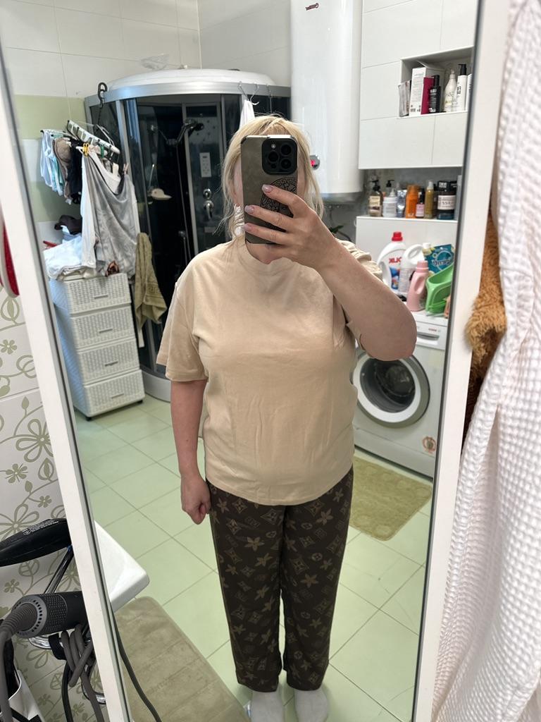Хорошая, качественная футболка. Не тонкая. Сейчас ещё жестковата, но после стирки думаю смягчится. На размер 48-50 взяла xl, не в обтяжку. Смотрится хорошо. Понравилась длина футболки.