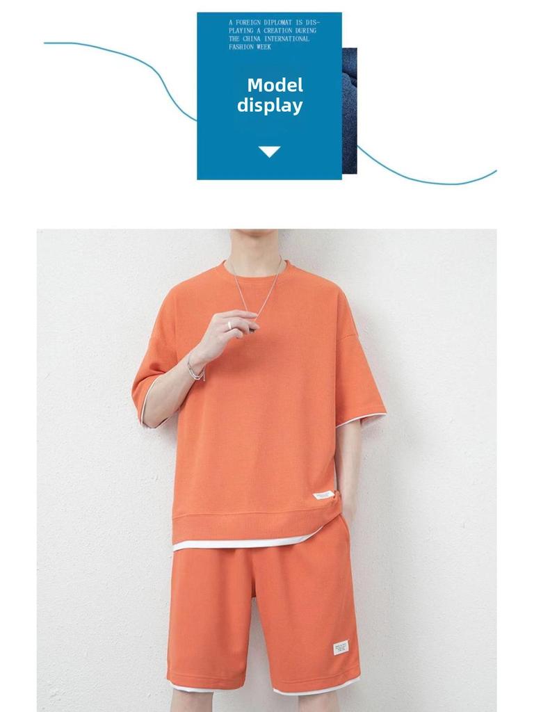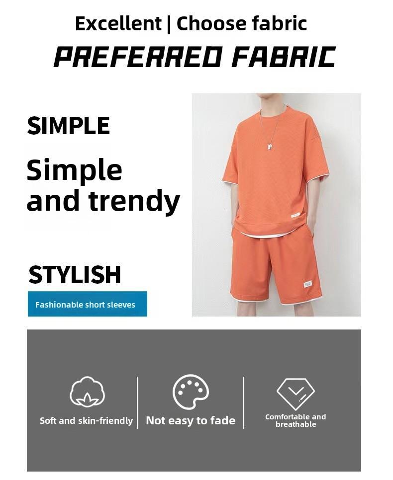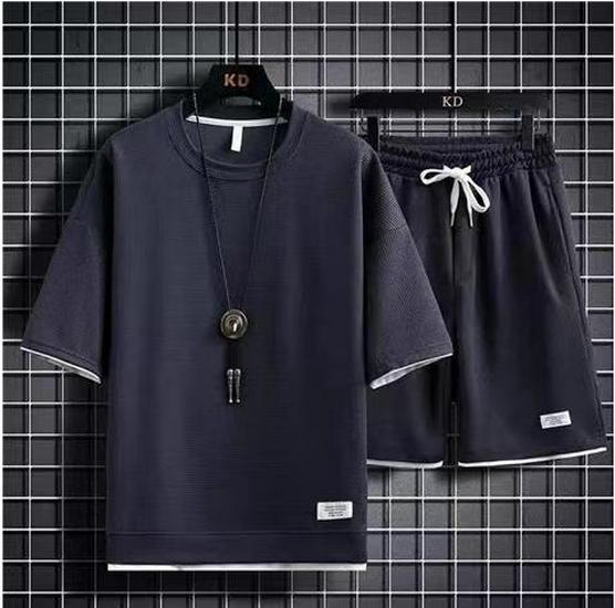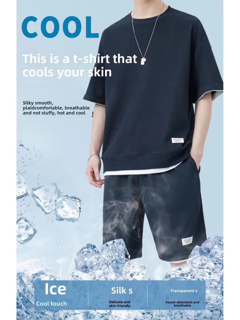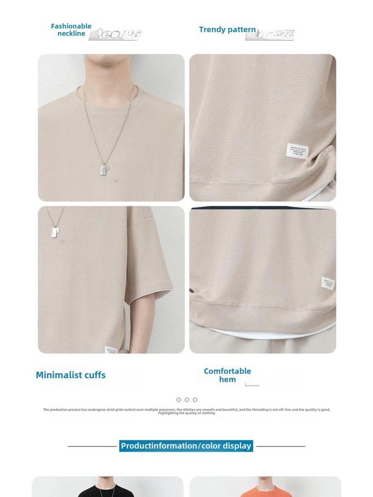 Мужской спортивный повседневный костюм-двойка в гонконгском стиле из вафельной ткани - свободный крой, короткие рукава