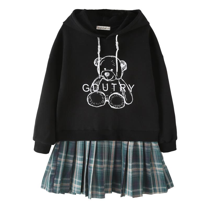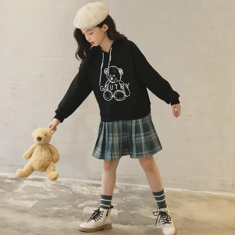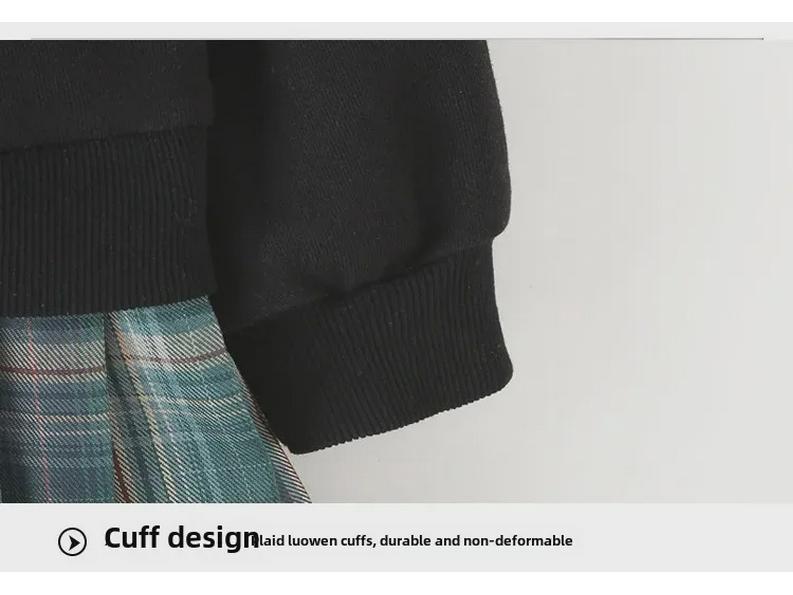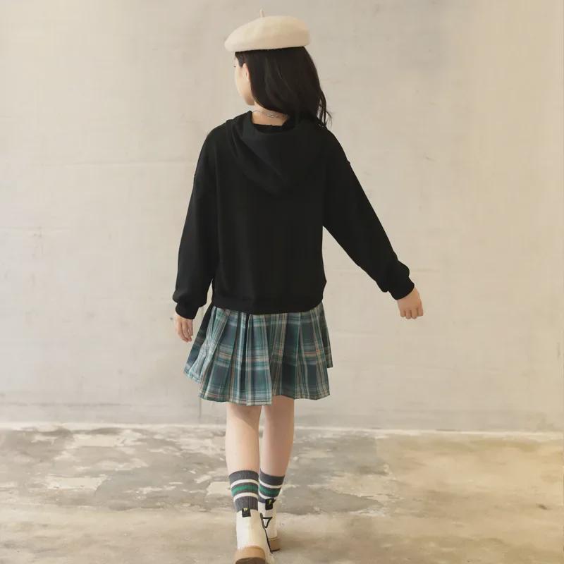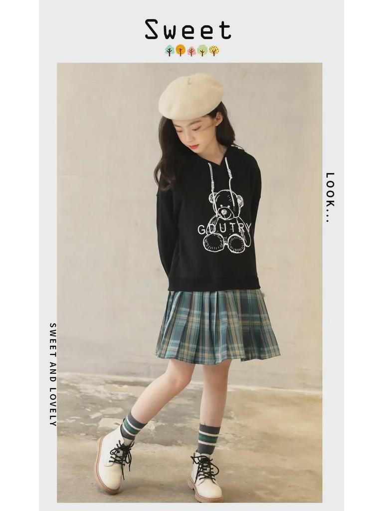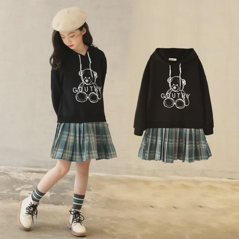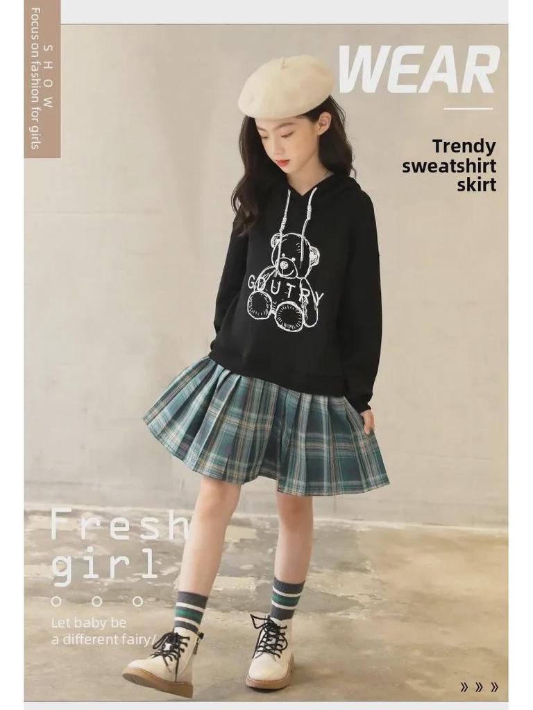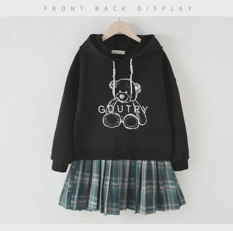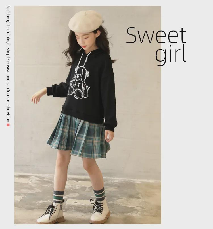 Платье-толстовка средней длины в складку в клетку для девочек на весну и осень 2024 г.