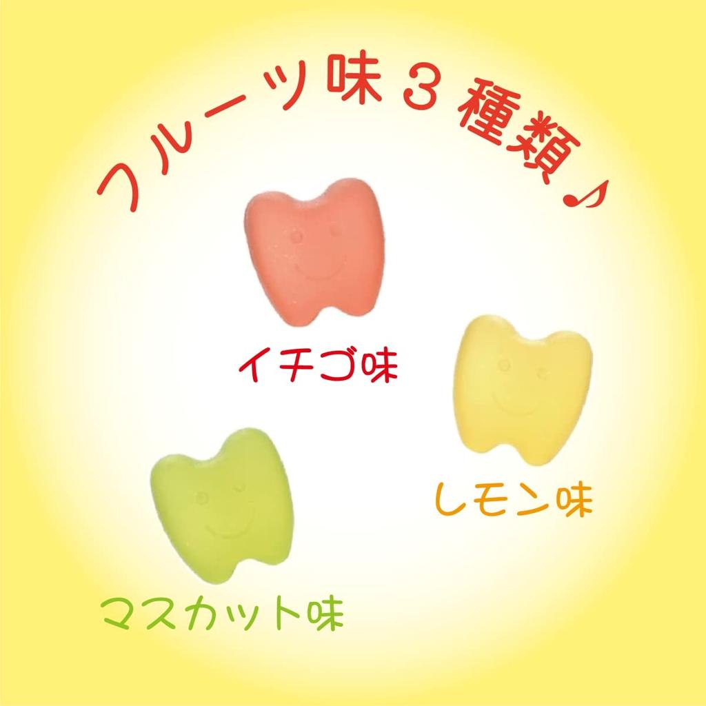 Доступно три вкуса: клубника, мускат и лимон. [Состав] Сниженный уровень крахмала, желатин, изомальт/олигосахарид, концентрированный фруктовый сок (лимон, клубника, мускат) порошок вафли, ксилит, лимонная кислота, осветлитель, ароматизатор, краситель