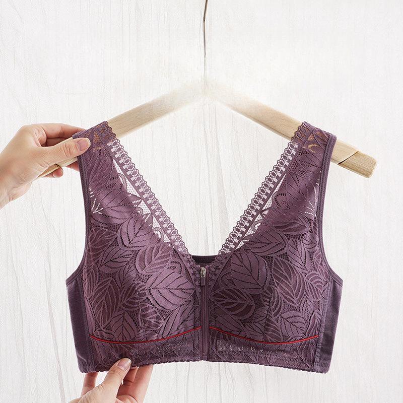 Мягкий хлопковый бюстгальтер с чашечками спереди, застегивающийся на молнию, для женщин среднего и пожилого возраста, без стального кольца, кружевной бюстгальтер большого размера