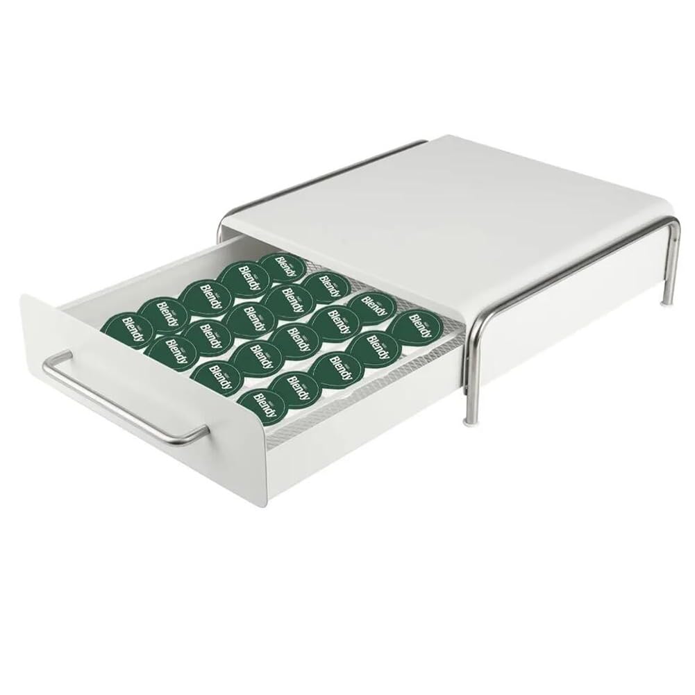 【Конструкция, экономящая место】Выдвижной ящик для кофе сохраняет столешницу аккуратной и свободной от беспорядка, обеспечивая при этом достаточно места для хранения кофейных капсул. Вертикальное хранилище удобно располагается под кофеваркой, нижняя полка предназначена для хранения кофейных капсул, а верхняя — для хранения бытовой техники.. Этот держатель идеально поместится на кухне, на стойке в общежитии или в кофейном баре в офисе.