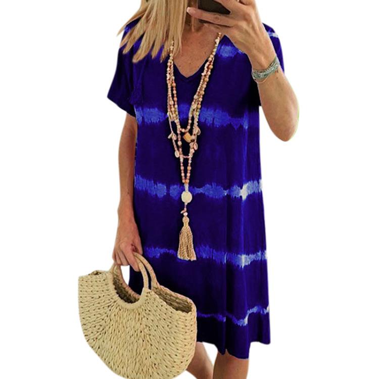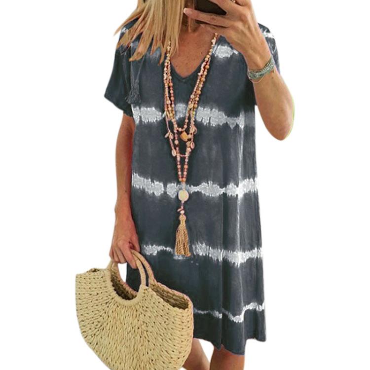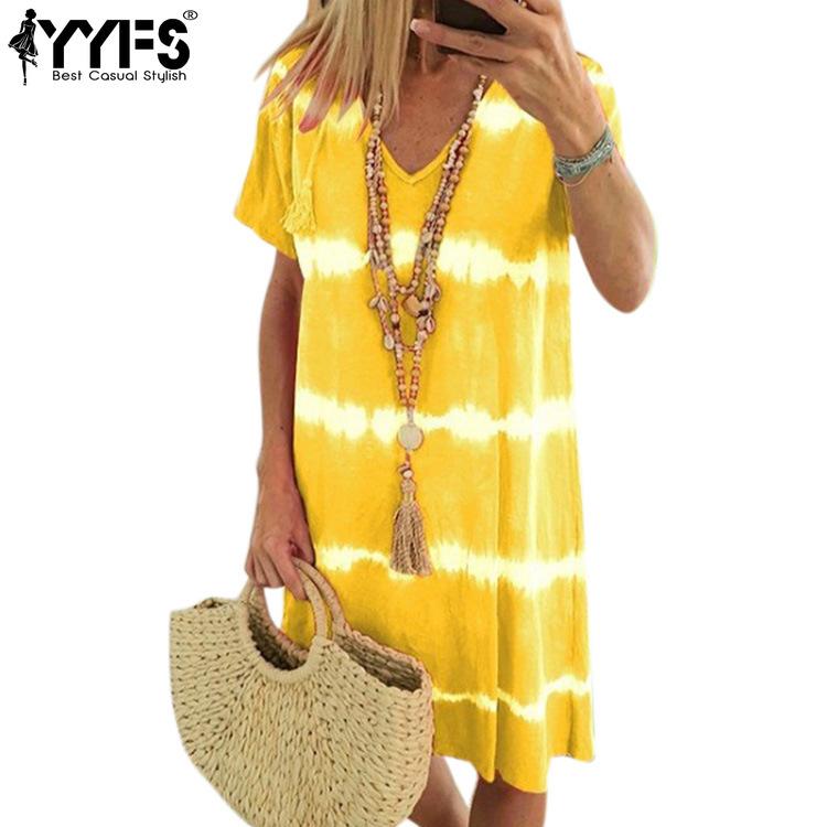 YYFS Женская мода лето весна цвет блок принт короткий рукав V-образный вырез свободная талия повседневные платья