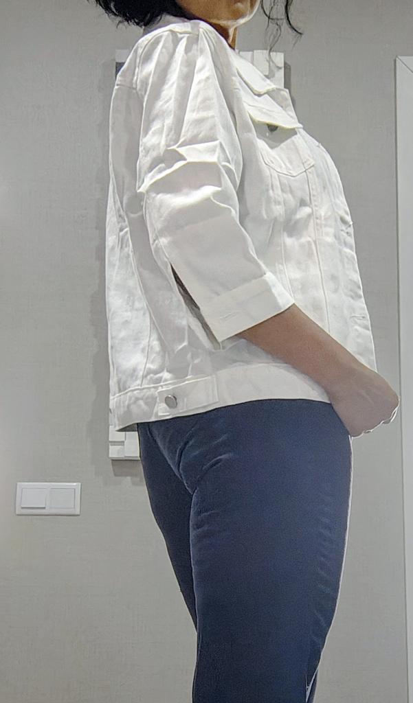 Пошив на троечку- торчащие нитки портят впечатление. Ткань- средней толщины джинса. По размеру - на мои параметры ог98, опг78, от78, об 100 рост 157 легла слегка свободно, как я хотела. Цвет не кипенно белый. Замеры куртки на фото.