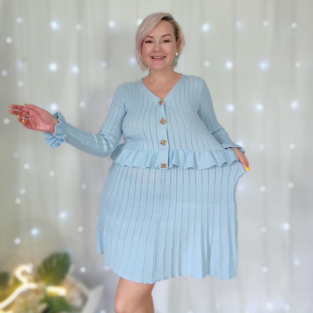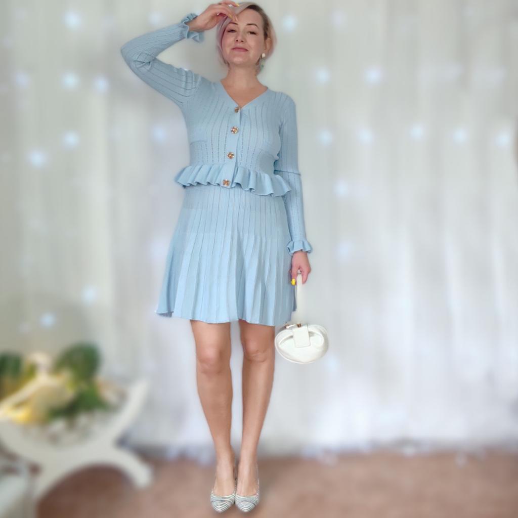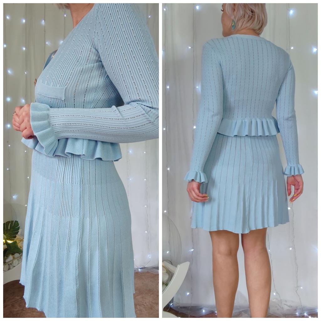 Трикотажное платье с мини - баской😍 Привет! Красивое, очень красивое платье из мягкого трикотажа в великолепном исполнении! ‼️Добавила разговорное видео посмотрите перед покупкой там больше деталей ‼️ Ткань : Трикотаж с большим со вискозы, ткань тонкая, но при этом имеет приятную тяжесть. Тип плетения замысловатый с мелкими перфорациями, на сколько мелкими, что бы не просвечивать нижнее белье, при этом создать воздушный эффект. Полотно хорошо тянется. Дизайн: Платье имеет две пуговицы на кнопках спереди, они скорее декоративные, тоесть их не надо растягивать, что бы надеть платье. Остальные пуговки просто пришиты. Сами пуговицы очень красивые с камушками - ну просто произведение искусства! На талии не большой волан в виде короткой баски, которая хорошо подчеркивает линию талии. Юбка имеет рисунок плиссе. Размер: На мне единый размер. Мои параметры : рост 172 см 98/76/106 см Детали: Длина 93 см ОГ 68 до 112 см ОТ 58 до 124 см ОБ 112 см (+) Длина рукава 59 см Резюмирую: Сезон У платье все же тёплый не смотря на длинный рукав. Очень нежное, качественное и красивое платье! От души рекомендую 👍 Я не прощаюсь, M_K #голубая_нежность