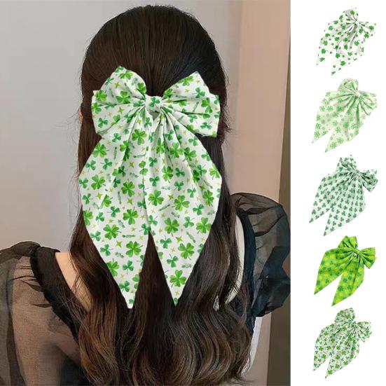 Очаровательный дизайн: Украсьте свою прическу нашей очаровательной заколкой-бантом из ленты в нежно-зеленой цветовой гамме, которая идеально подойдет для придания весеннего настроения любому образу.. Узор с четырехлистным клевером добавит вашему образу естественности и причудливости.