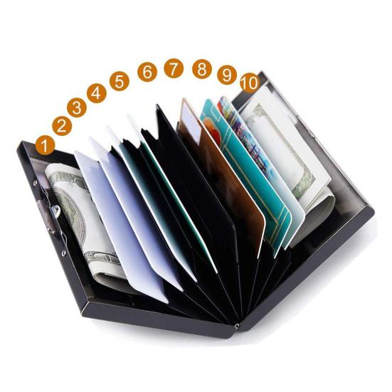 Функциональность нескольких слотов: Этот держатель карт вмещает до 10 карт, включая кредитные карты, удостоверения личности и многое другое, и предлагает универсальные варианты хранения для различных типов карт.