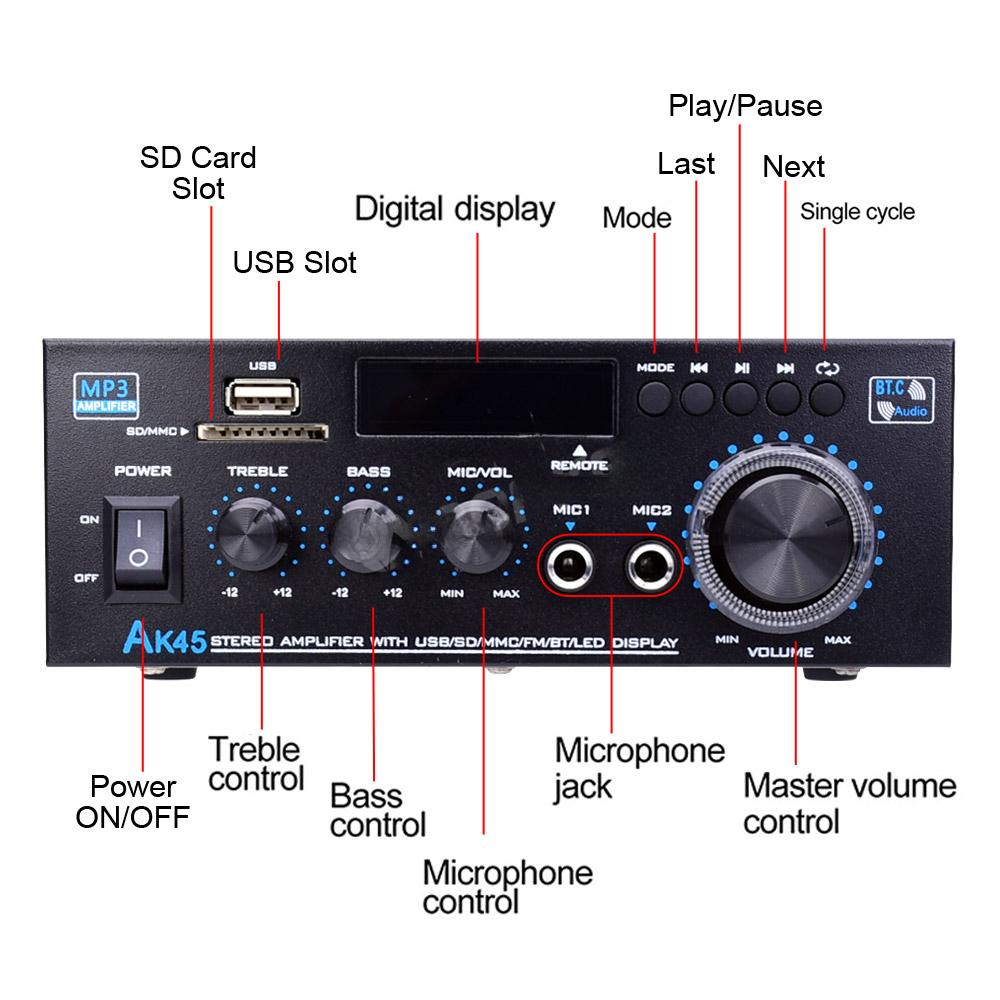 5. 🔊 **Превосходное управление звуком** 🔊 Возьмите на себя ответственность за свою аудиосреду с помощью индивидуальной регулировки высоких и низких частот, а также громкости.. AK45 обеспечивает чистую среднеквадратичную мощность 40 Вт на канал с максимальной мощностью 90 Вт, обеспечивая насыщенный, сбалансированный звук, который заполняет любое пространство без искажений.