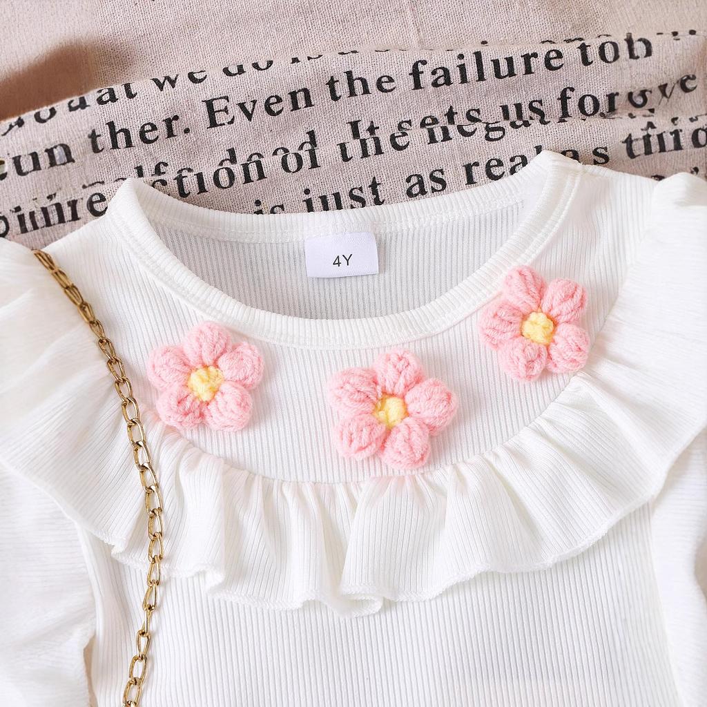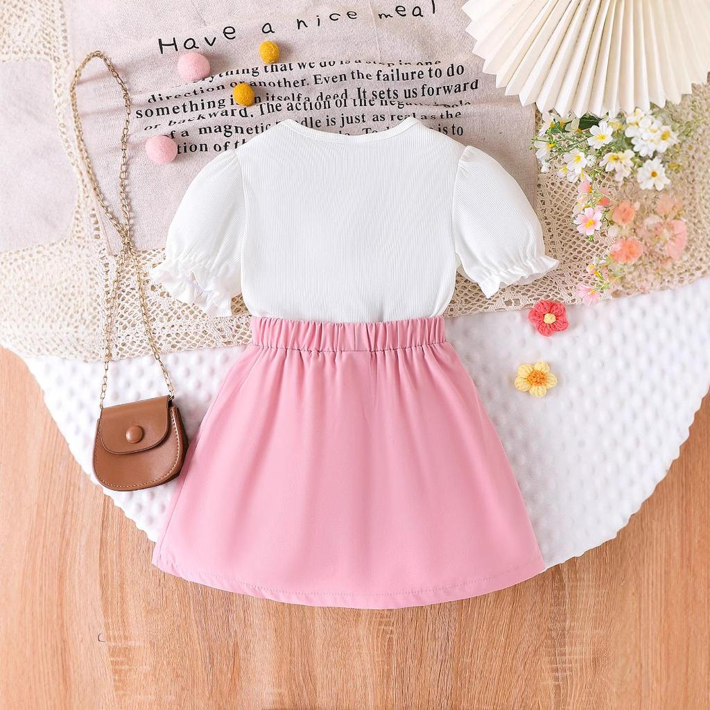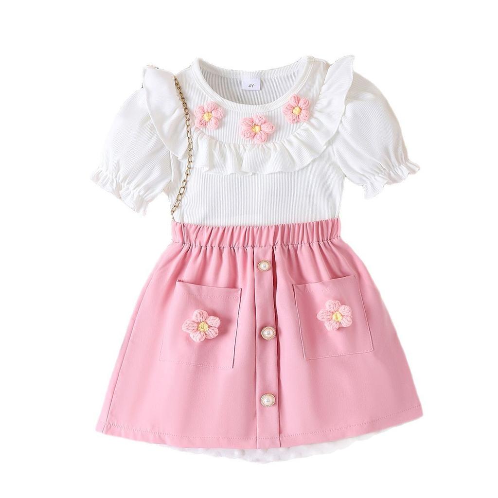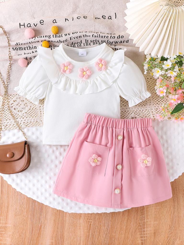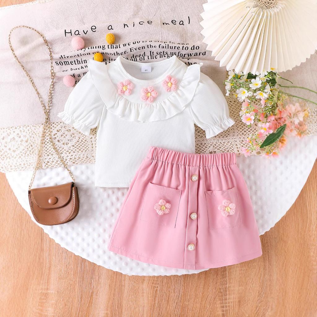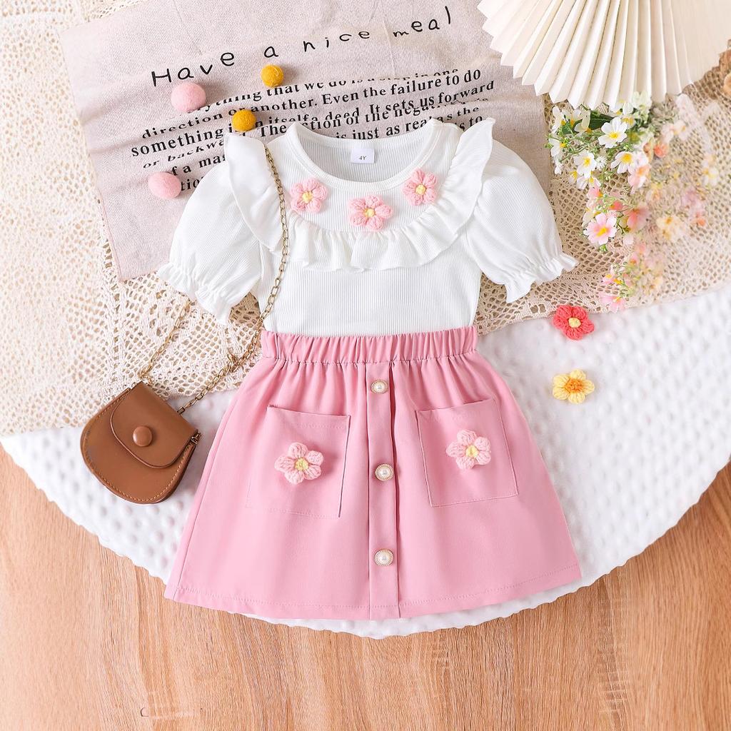 Милый комплект для девочек 2025 года, летний детский модный комплект с цветочным декором и коротким рукавом + юбка