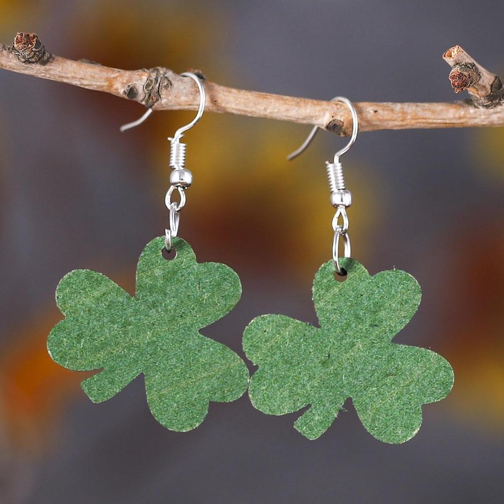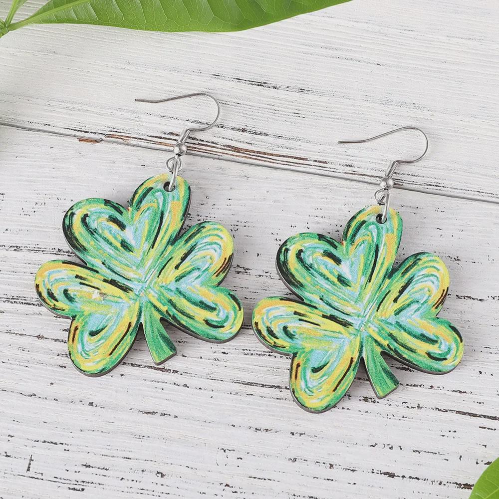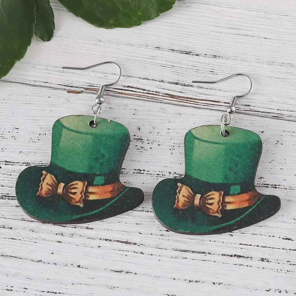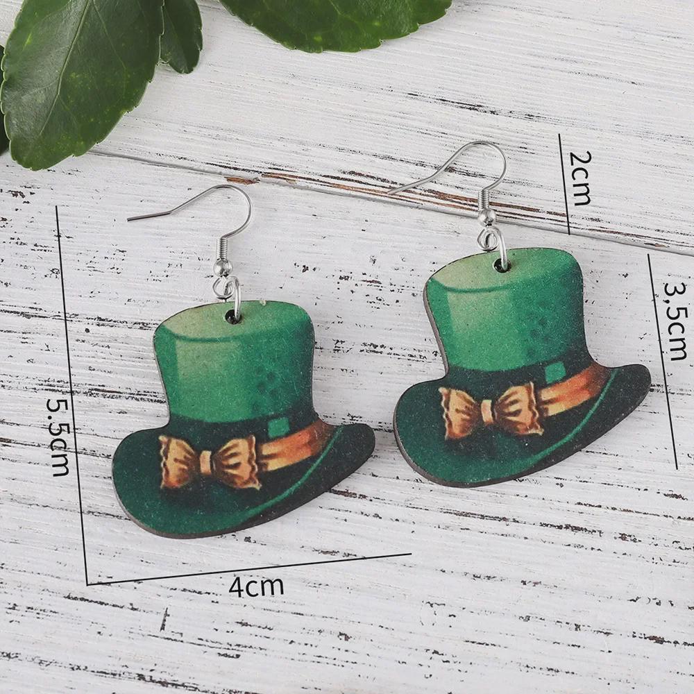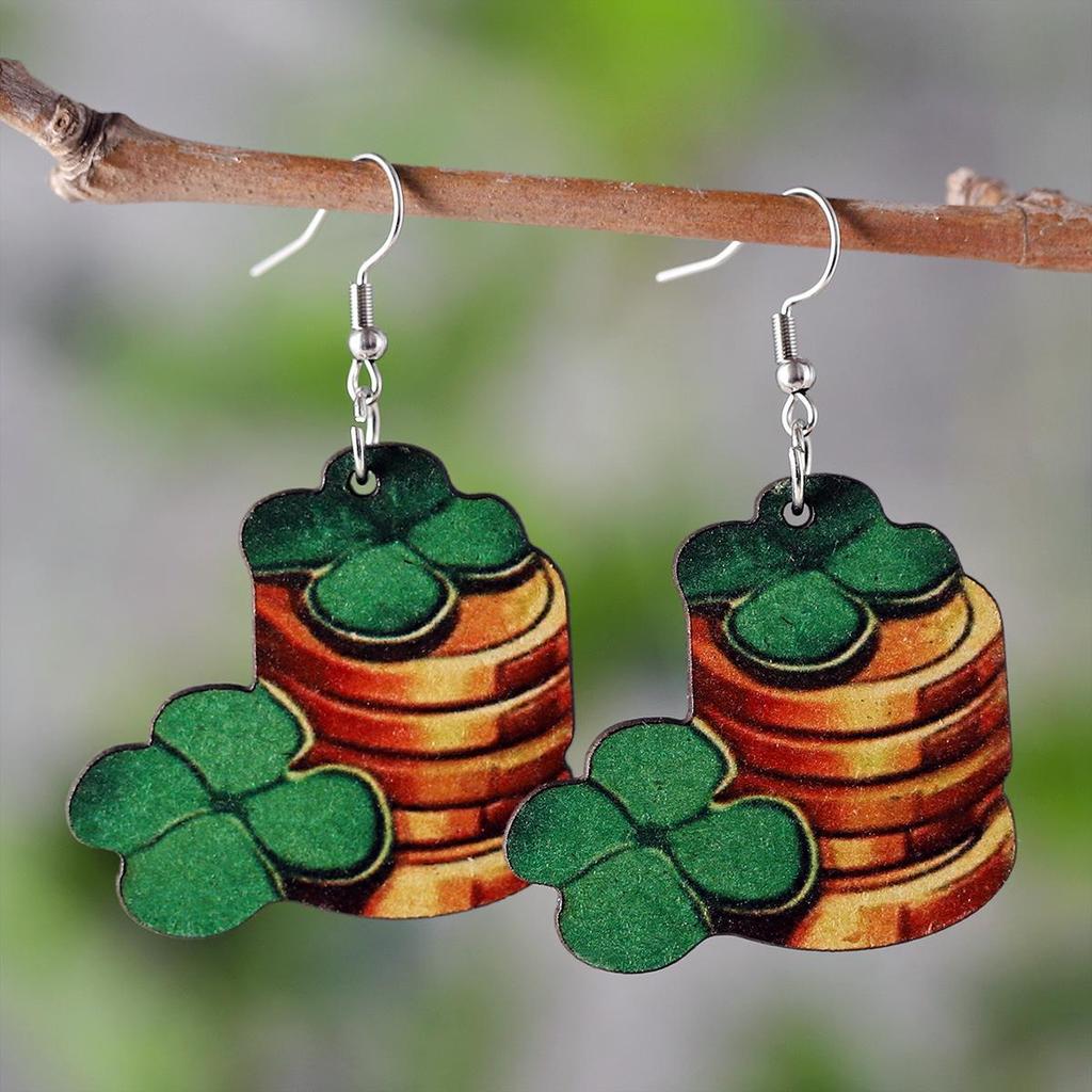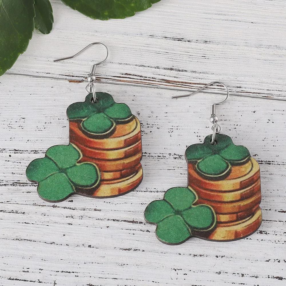 Улица. Деревянные серьги с подвеской в виде зеленого котенка и клевера ко Дню Святого Патрика