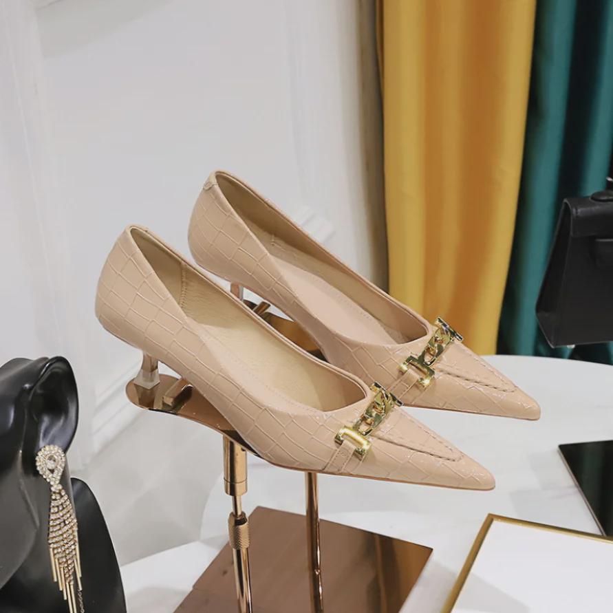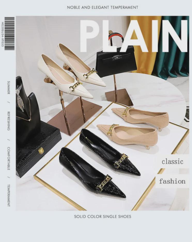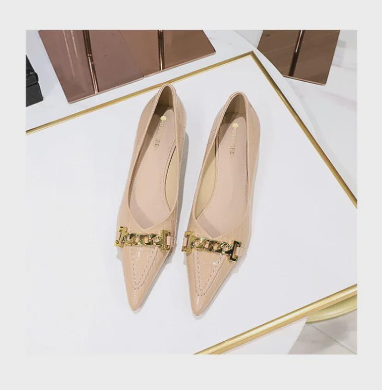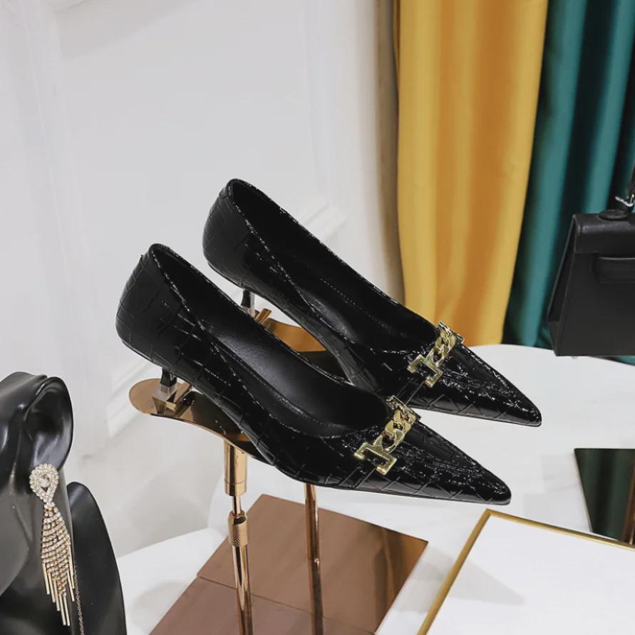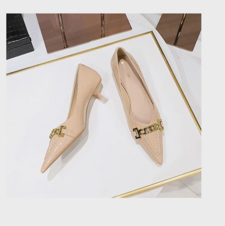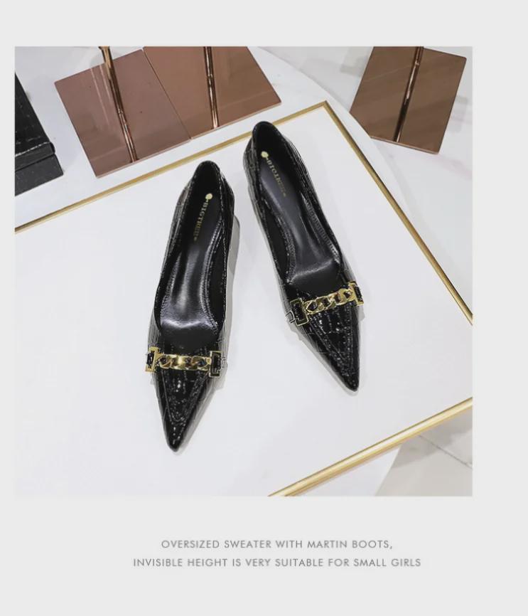 Ощутите элегантность и стиль с этой изысканной обувью, созданной специально для женщин.. Эти туфли с верхом из блестящей лакированной кожи, острым носком и средним каблуком идеально подойдут для придания нотки изысканности любому образу.. Декор в виде металлической цепи добавляет дизайну современный и шикарный элемент.. Резиновая подошва обеспечивает долговечность и комфорт, а полиуретановая подкладка и стелька обеспечивают мягкость и поддержку для ношения в течение всего дня.. Будь то особый случай или обычный день в офисе, эта обувь станет стильным выбором, не идущим на компромиссы с комфортом.