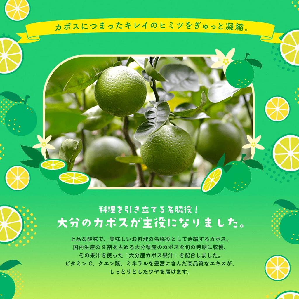 ●Ингредиенты для ухода за кожей: Сок плодов Кабосу из Оита, экстракт плодов шиповника ●Увлажняющие ингредиенты: Экстракт капусты из Оита ●Ингредиенты для твердости и блеска: Экстракт листьев артишока, производное витамина С
