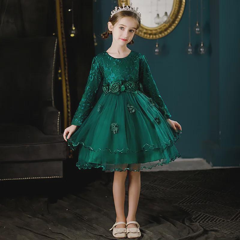 Платье принцессы для девочки-цветочницы с длинными рукавами и пышной юбкой из тюля - детский костюм для свадьбы и выступлений