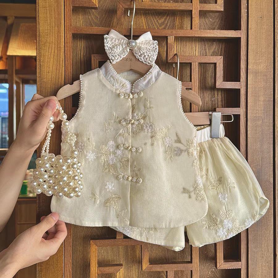 Летний комплект для девочек 2024 года из жилета и шорт в китайском стиле