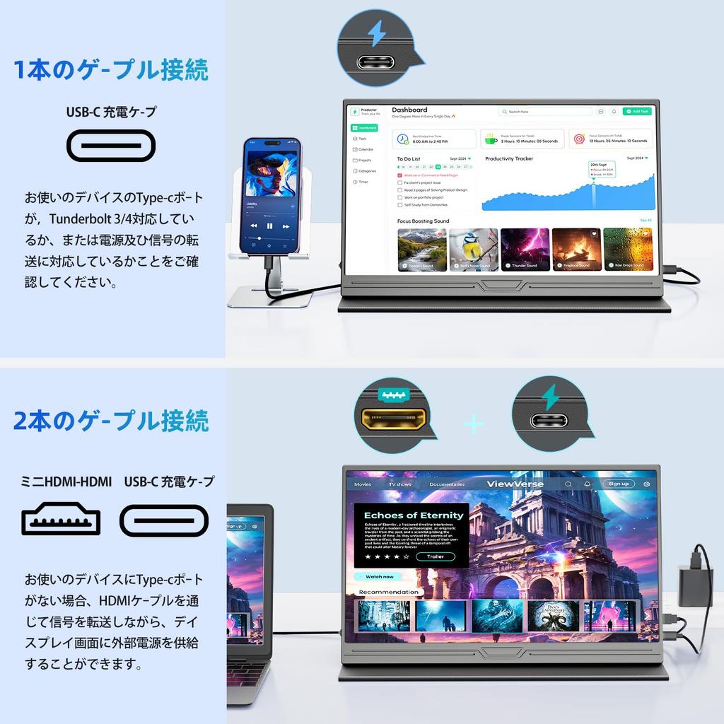[Single Cable Video Output and Power Supply/Compatible with a Wide Range of Models] Video output and power supply can be performed with a single cable to PCs, smartphones, etc. that can be connected via a Type-C cable. ((If you don't have Type-C Thunder 3/4 or higher, please also connect the power cable). It's very easy to connect, so you can enjoy YouTube, games and videos anytime and anywhere, and you can use it for business web meetings and presentations. Compatible with a wide range of devices such as node PCs, desktops, smartphones, PS4/PS5, XBOX, Switch, Macbook, MacMini, and iPad (with Type-C port mode).