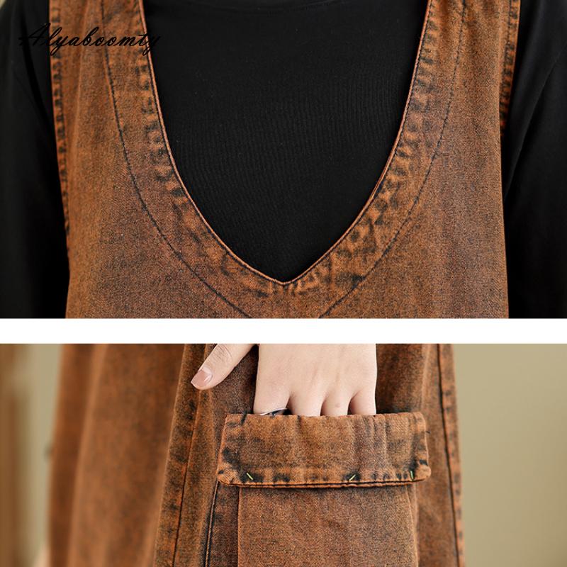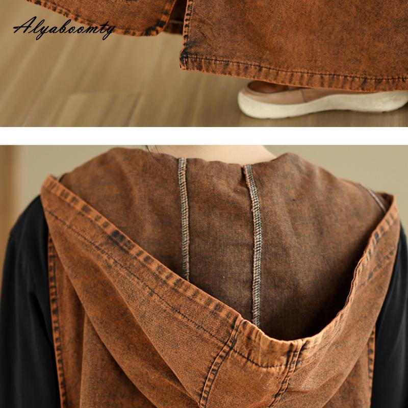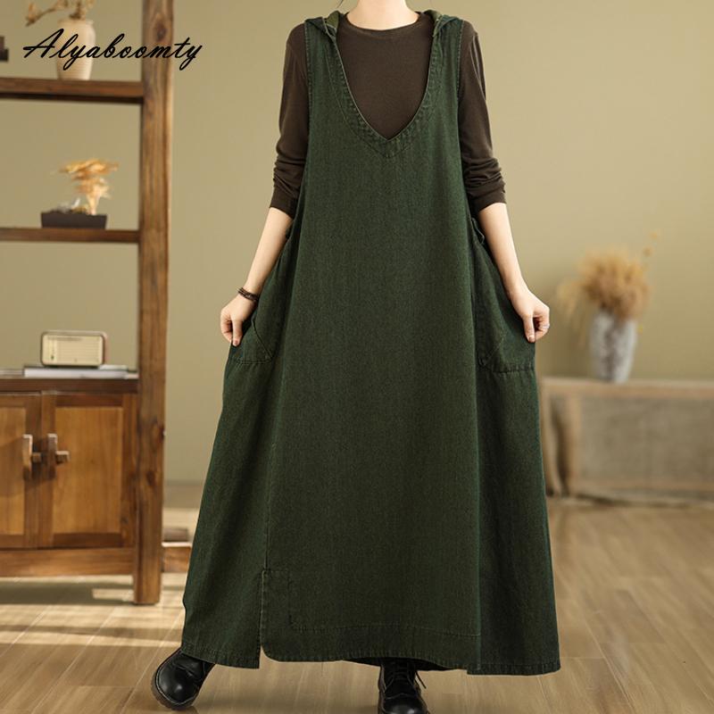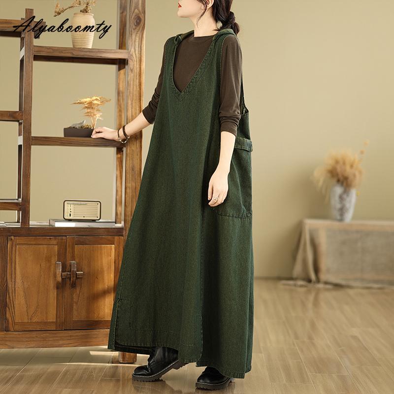 Плюс размер корейский стиль весна осень женское макси длинный сарафан с капюшоном V-образный вырез коричневый зеленый повседневный свободный безрукавка платье винтажное джинсовое платье без рукавов