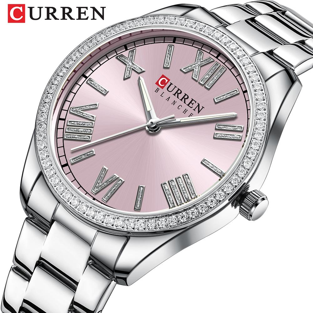 CURREN Роскошные кварцевые женские часы-браслет с очаровательным серебряным циферблатом из горного хрусталя и люминесцентными стрелками из нержавеющей стали