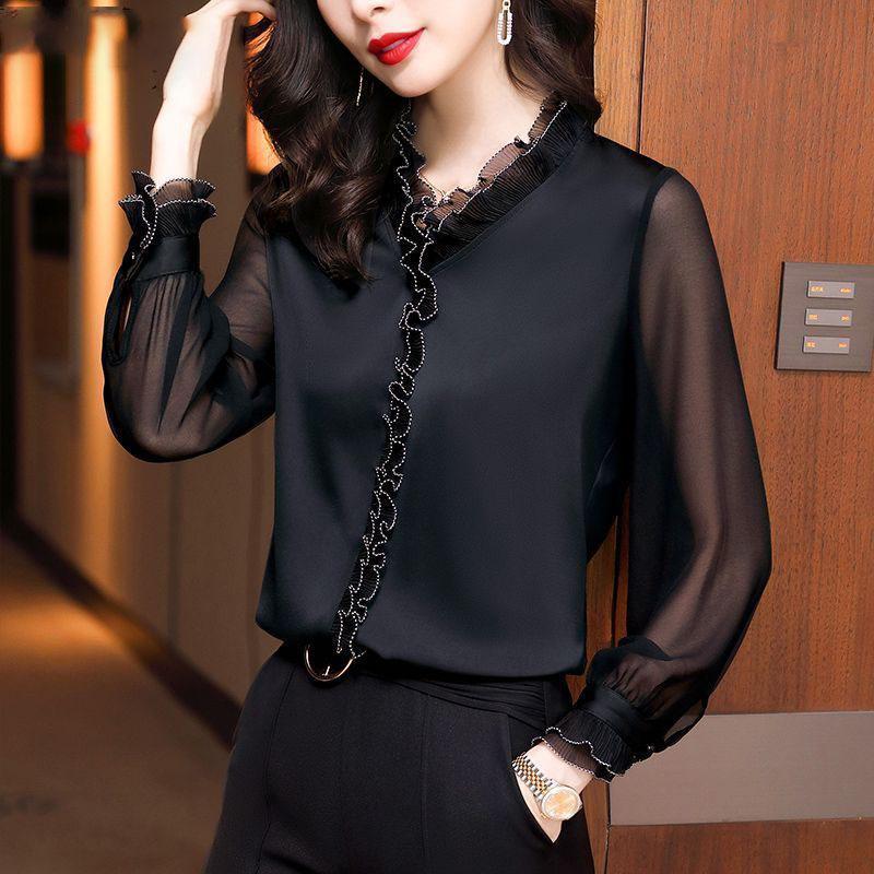 Элегантная женская шифоновая рубашка корейская блузка офисная кружевная сетка длинный рукав оборки V-образный вырез топы повседневные винтажные пуловеры блузы