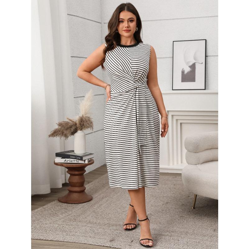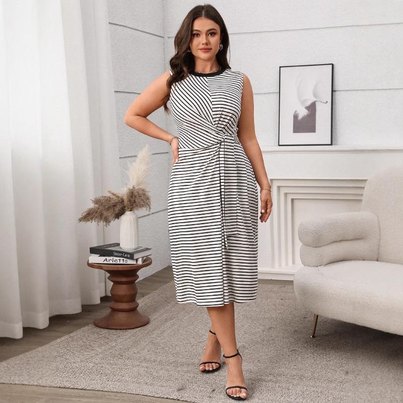 Плюс Размер Женское Летнее Элегантное Высокое Талия Круглый Вырез Свободное Полосатое Платье