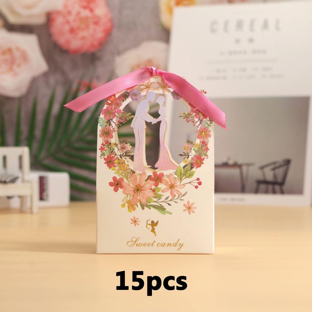 15 шт. Цветочные коробки для конфет с лентами, упаковочная коробка для свадебного подарка, мешочки для угощений на девичник, подарочная упаковка, бумажные принадлежности для вечеринок, подарок на свадьбу