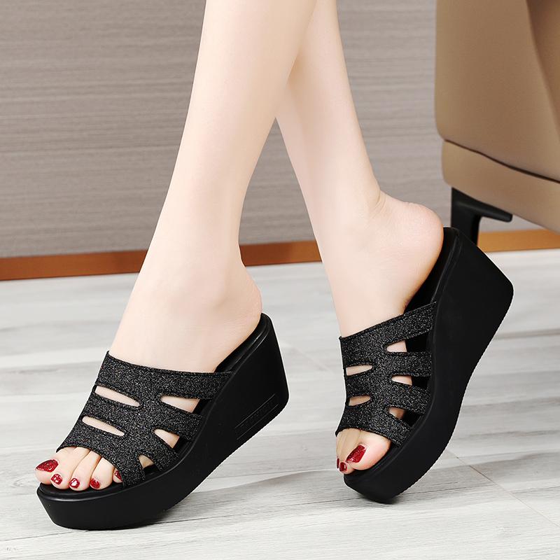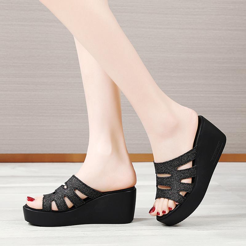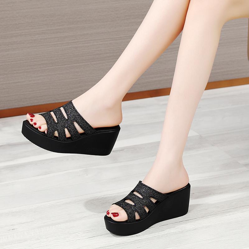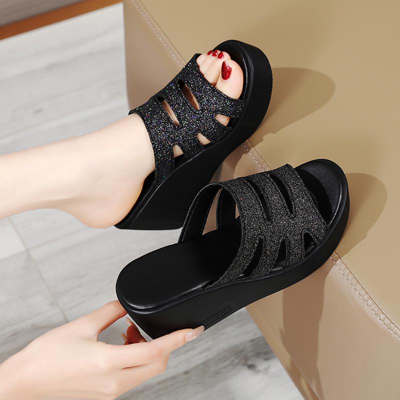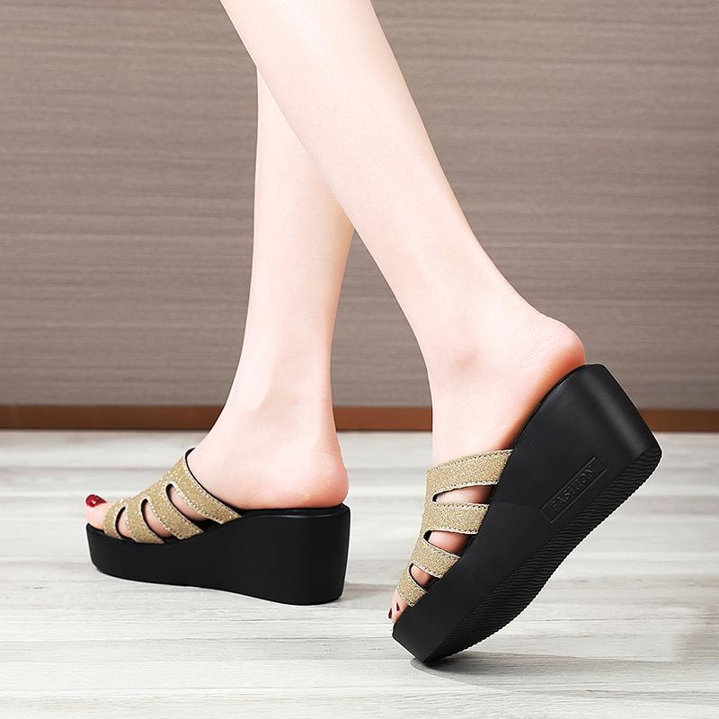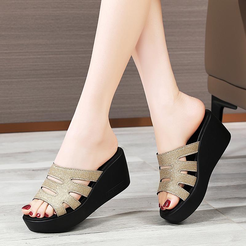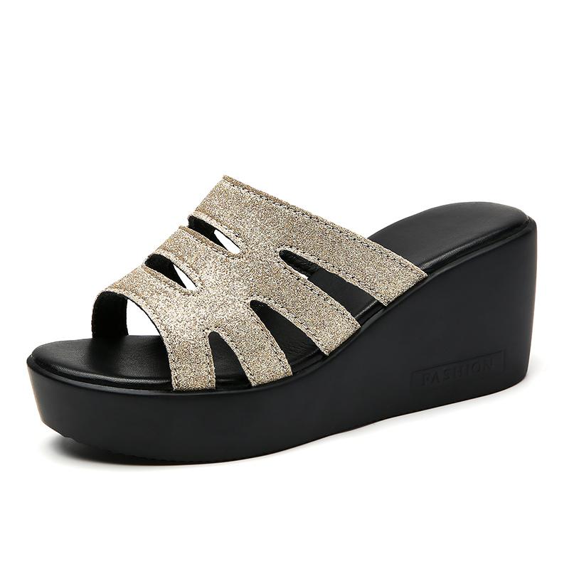 Женские золотистые шлепанцы, летние уличные нарядные черные туфли на толстой танкетке, повседневные тапочки на толстой подошве, большие размеры