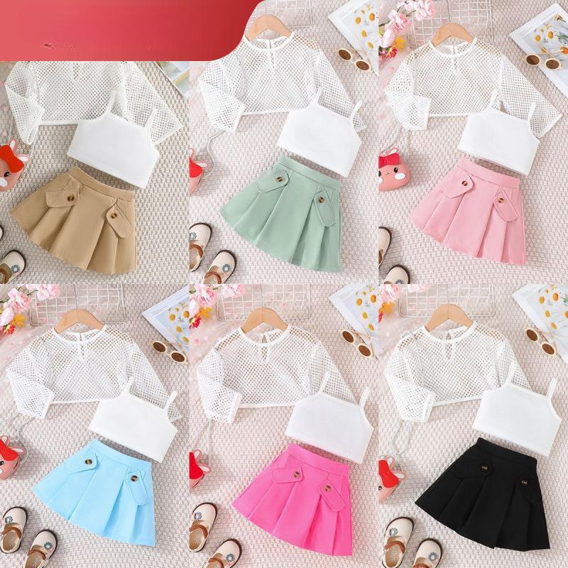 Модный костюм для девочек Детское повседневное сетчатое пальто + жилет на бретельках + плиссированная юбка Костюм-тройка