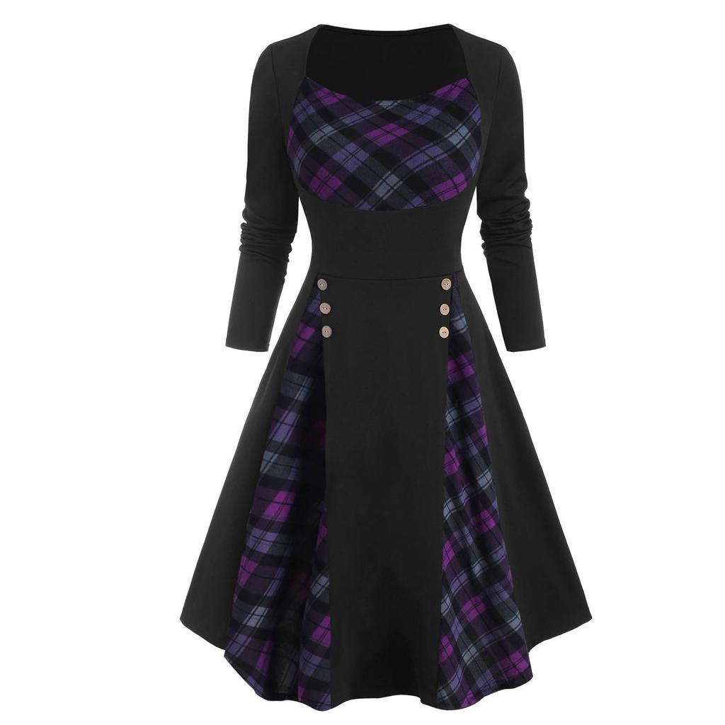 Женское винтажное клетчатое лоскутное платье с длинными рукавами и круглым вырезом на пуговицах