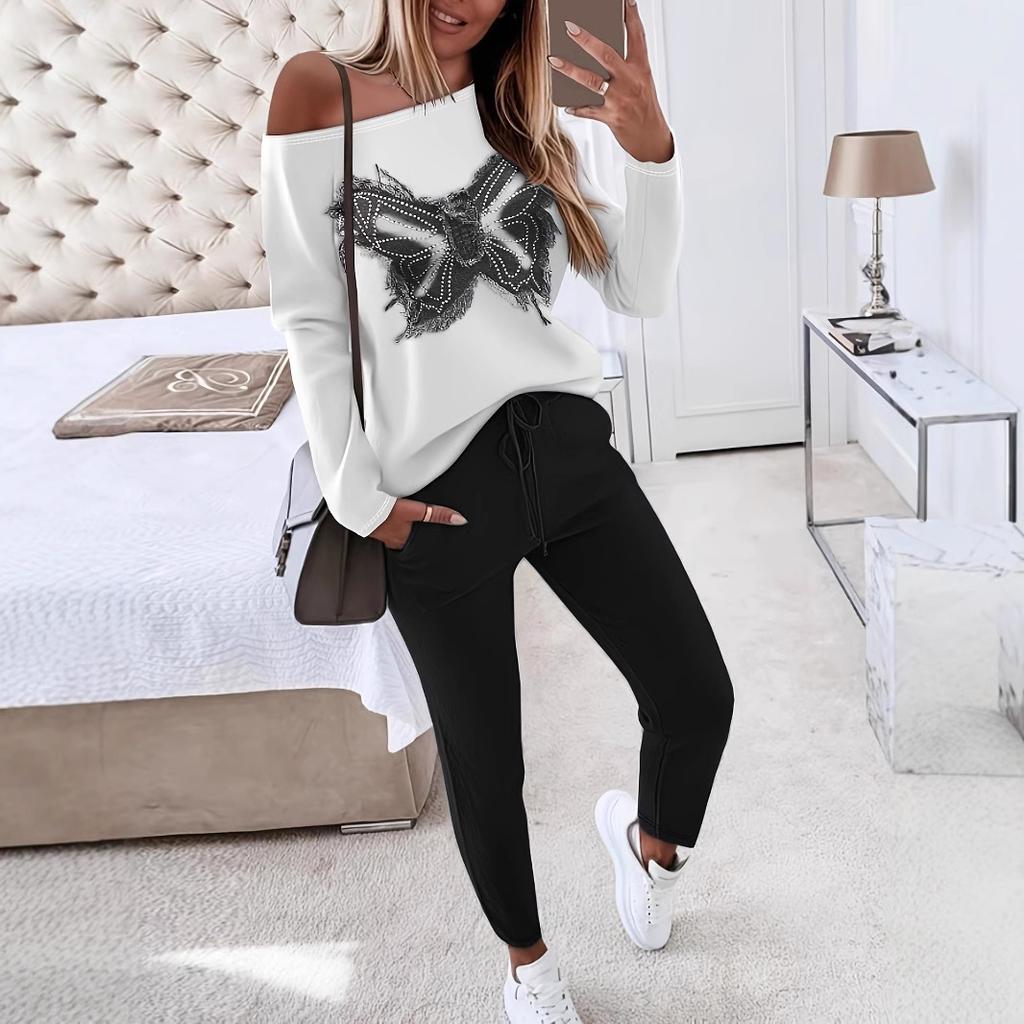 Женские комплекты с декоративной аппликацией в виде бабочки, длинными рукавами, косыми плечами, однотонные брюки на завязках, комплект из двух предметов — купить товар онлайн с бесплатной доставкой по всему миру!
