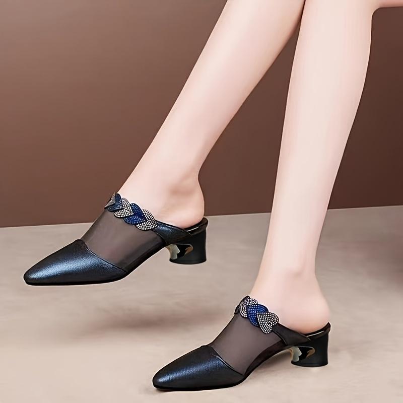 Сандалии на толстом каблуке - Декор из стразов, острый носок, повседневные туфли на среднем каблуке - Модные женские туфли без застежек