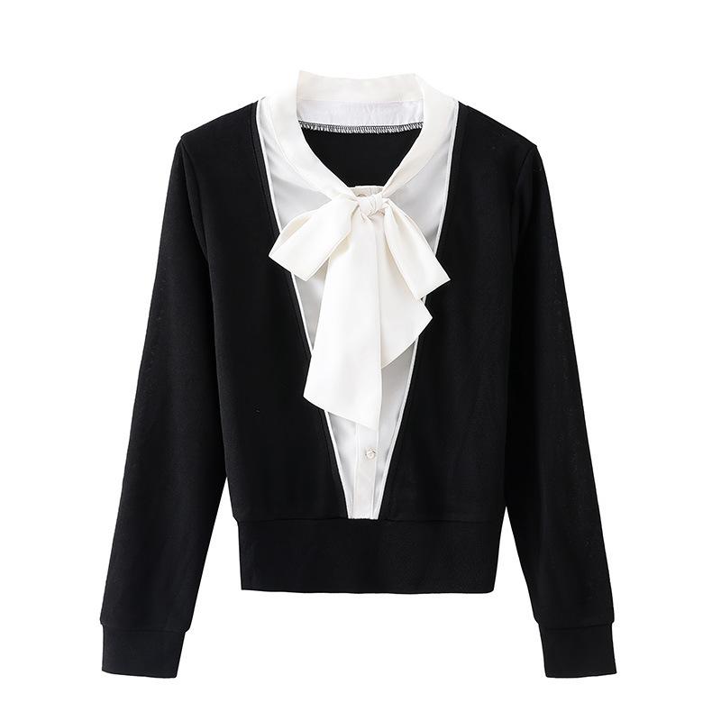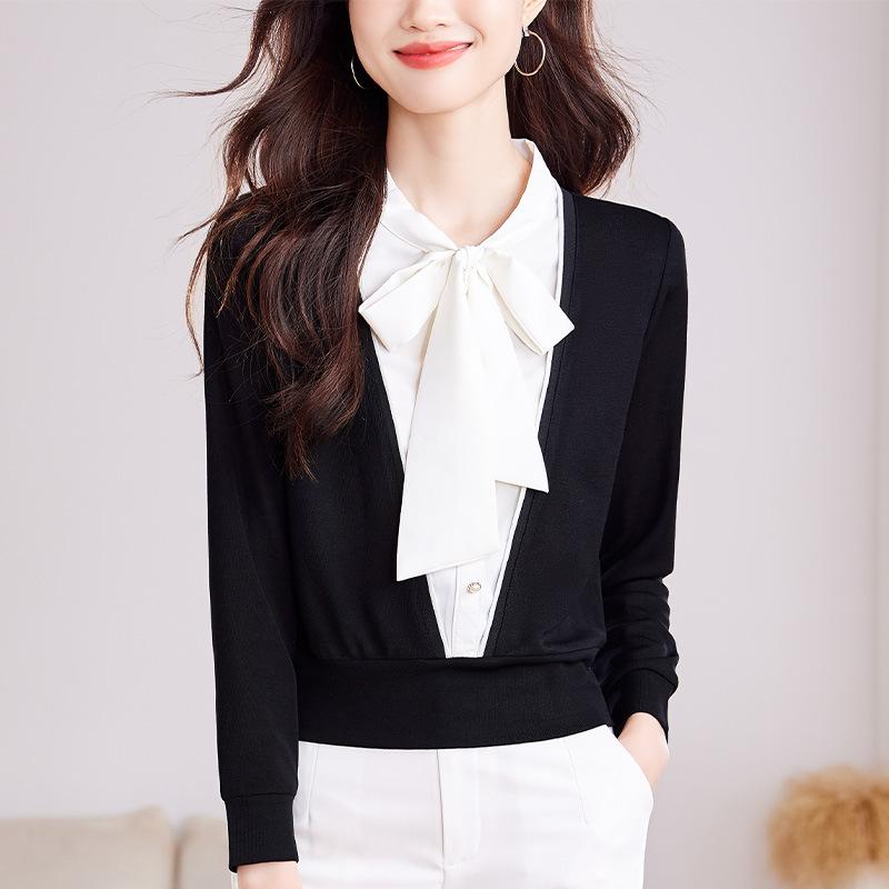 Этот трикотажный пуловер имеет свободный силуэт, обеспечивающий комфортное и непринужденное ношение.. Уникальный воротник-шарф с большим галстуком-бабочкой добавляет нотку элегантности и женственности.. Длинные стандартные рукава и однорядная застежка на несколько пуговиц одновременно практичны и стильны.. Изготовлен из трикотажного полотна с добавлением полиэфирного волокна, имеет мягкую и эластичную текстуру.. Идеально подходит для создания элегантного и делового образа во время поездок на работу.