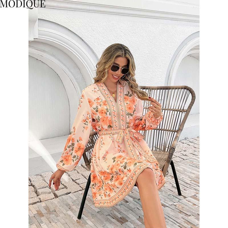 MODIQUE 2025 Лето Плюс Размер Новое Женское Повседневное Сексуальное Цветочное Печать Талия Плавный Пояс Короткое Платье Женское Платье А-силуэта с Рукавом Фонариком V-образным Вырезом