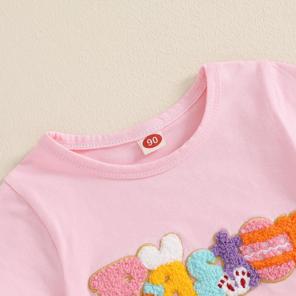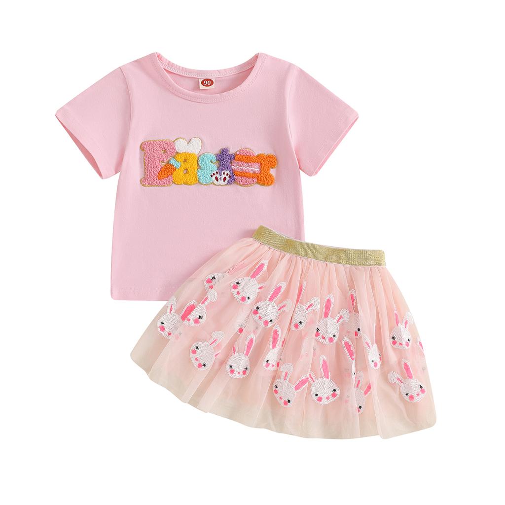Пасхальный наряд для малышей, вышитые буквы, короткий рукав, круглый вырез, топ, юбка-трапеция с пайетками и кроликом, комплект из 2 предметов