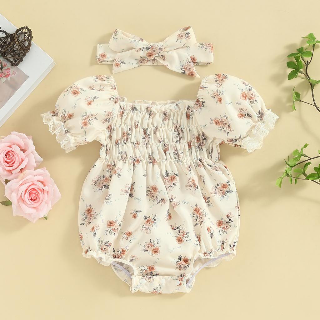 Летний наряд для девочки, комбинезон с квадратным вырезом, кружевной отделкой, рукавами-фонариками и цветочным принтом + повязка на голову с бантом, комплект из 2 предметов для малышей