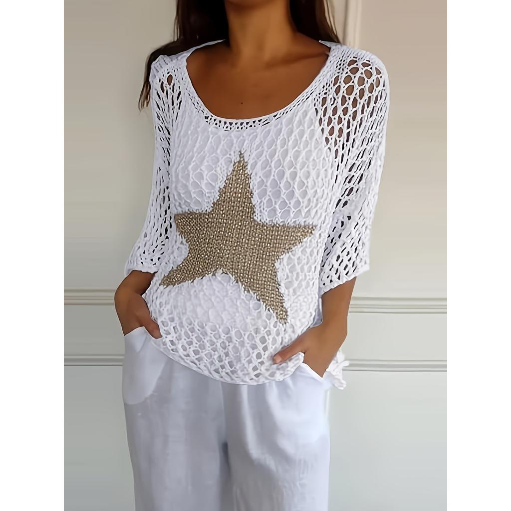 Женский свитер, свободный ажурный вязаный кардиган со звездами, круглый вырез, рубашка от солнца, летний купальник, накидка