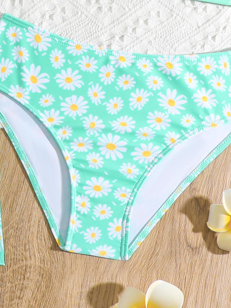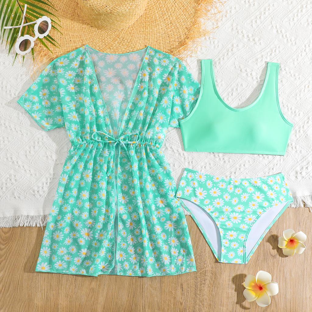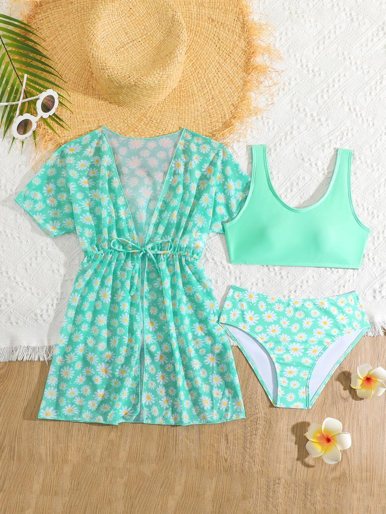Модный комплект купальников для девочек из 3 предметов: топ с цветочным принтом, короткие рукава, накидка на шнуровке, купальный костюм