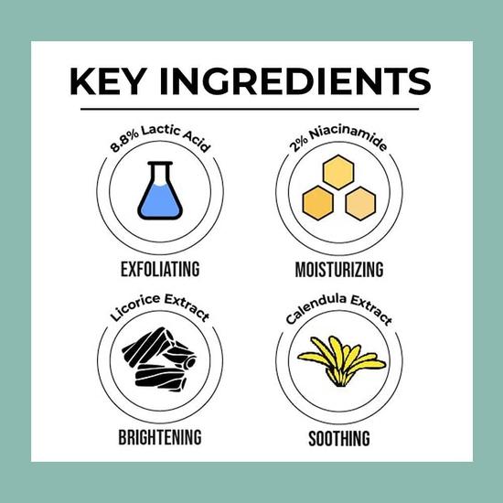 КАК ЭТО РАБОТАЕТ: Молочная кислота отшелушивает, растворяя омертвевшие клетки кожи и придавая ей яркий и свежий цвет лица.. Ниацинамид способствует уменьшению пор и увлажняет кожу, одновременно снижая избыточную выработку кожного сала.. Экстракты солодки и календулы осветляют и успокаивают кожу.