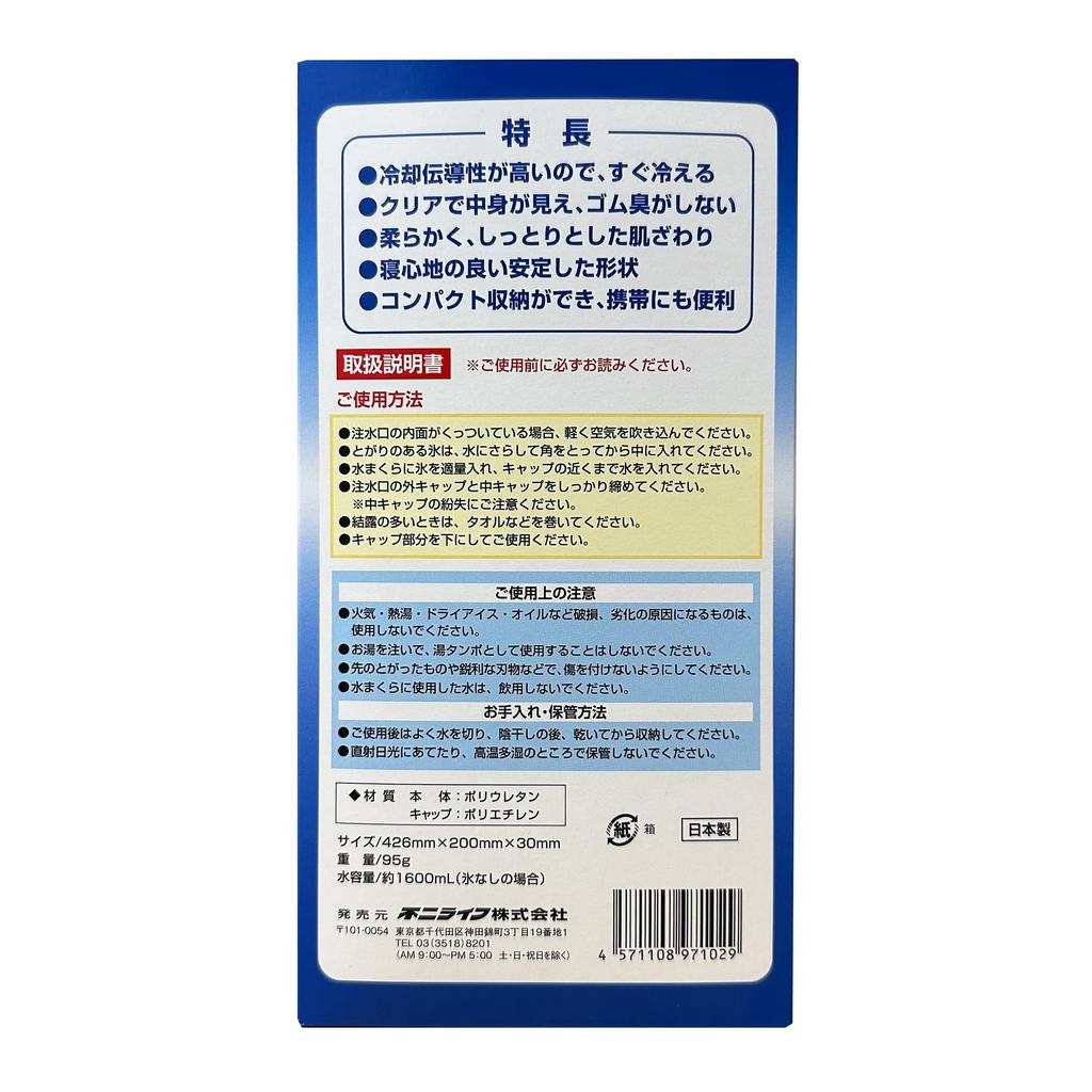 ●Новый тип водяной подушки с мягкой поверхностью, которая быстро охлаждается водой и льдом ●Полиуретановый материал с высокой теплопроводностью ●Прозрачный, чтобы было видно содержимое, без запаха резины ●Мягкая и влажная текстура ●Устойчивая форма, на которой удобно спать ●Компактно хранится и удобна для переноски ●Размер: 426мм x 200мм x 30мм ●Вес: 95 г ●Вместимость воды: Приблизительно 1600 мл (без льда)