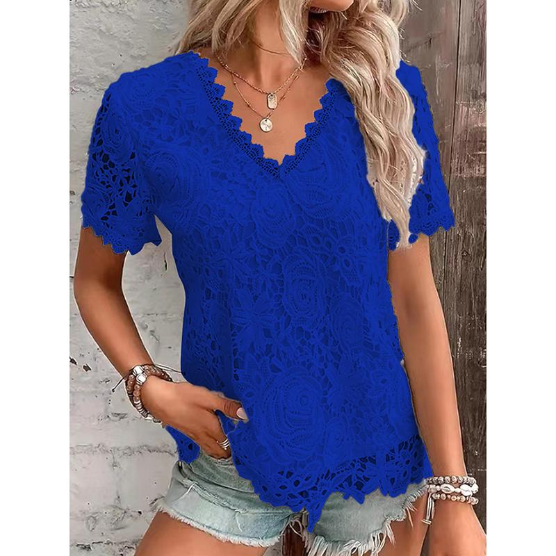 Летняя мода для девочек, элегантная, сексуальная, с V-образным вырезом, кружевная, с коротким рукавом, женская верхняя одежда, ажурные блузки, уличная одежда для отдыха