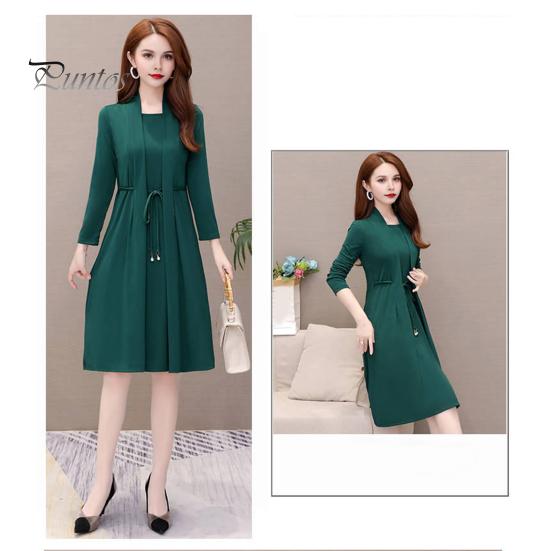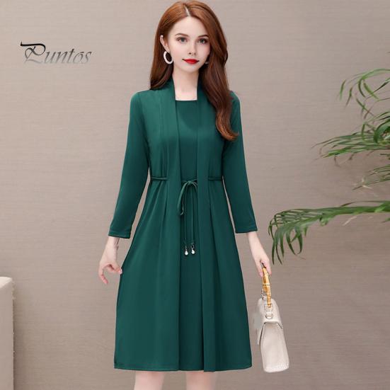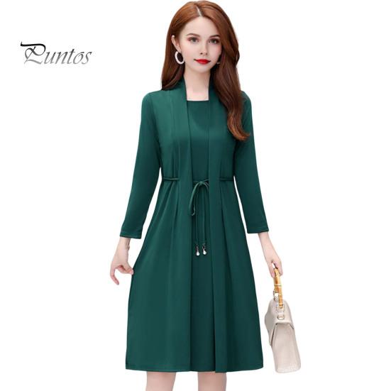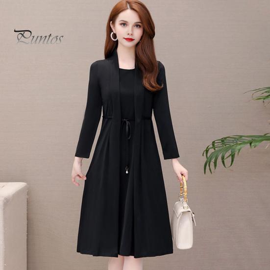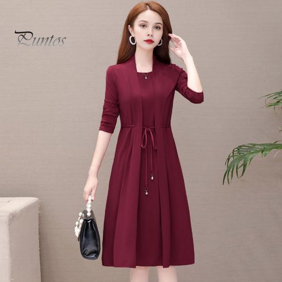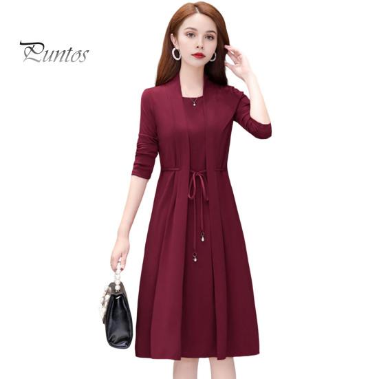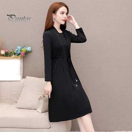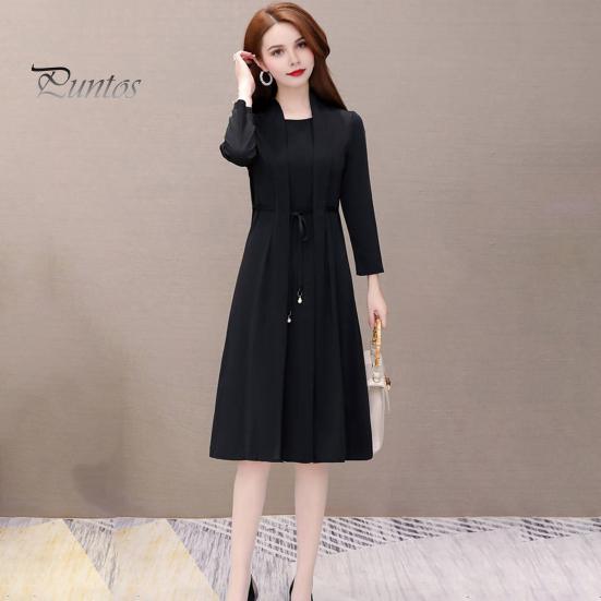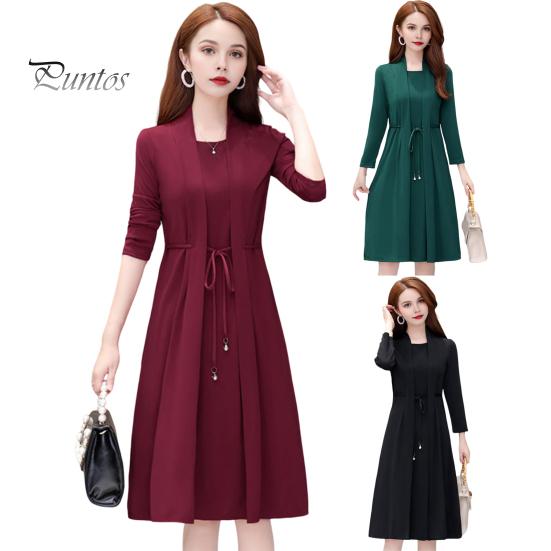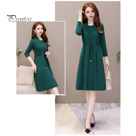 Женское платье, имитация двух частей, формальный элегантный стиль, шнуровка на бретелях, плюс размер, длинный рукав, дорожная одежда, платье-трапеция, офисное платье миди