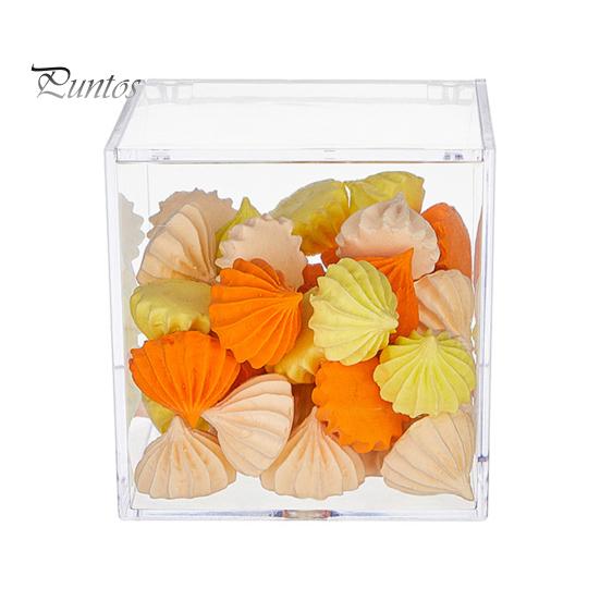 Представляем акриловую коробку с удобной откидной конструкцией для легкого доступа. Плавный механизм открывания и закрывания обеспечивает быстрое извлечение продуктов питания, эффективно защищая их от влаги и пыли.. Изготовленная из высокопрозрачного пластика, эта коробка обеспечивает хорошую видимость, позволяя вам легко выбирать нужные товары и повышая привлекательность продукта.. Эти компактные и креативные коробки, доступные в различных размерах от 4,5 до 10 см, добавят нотку уникальности вашим свадебным конфетам, печенью или сладостям..