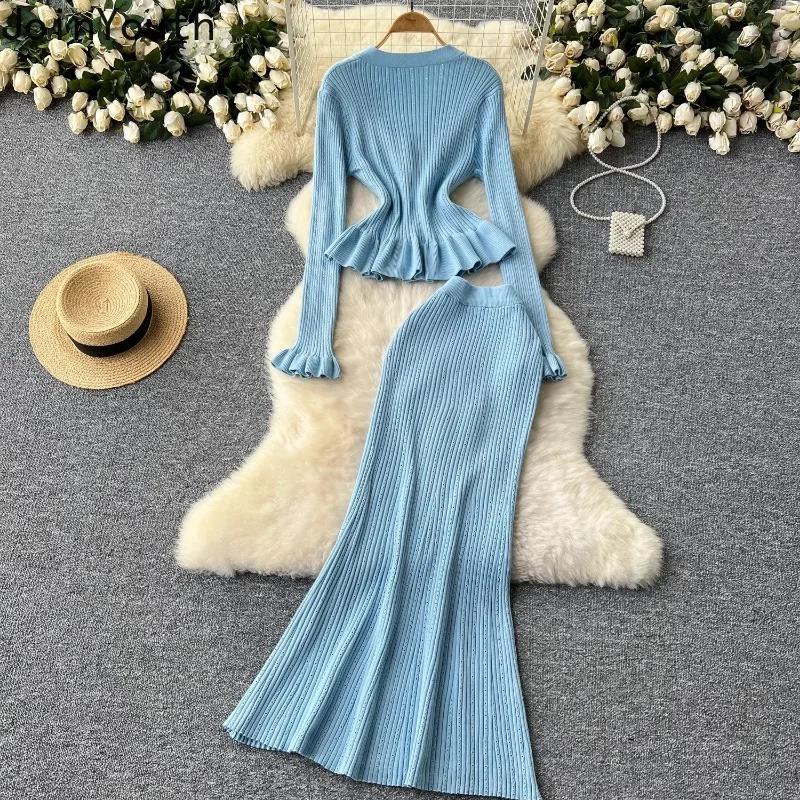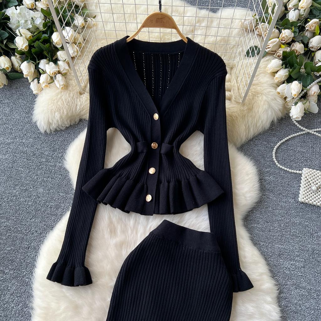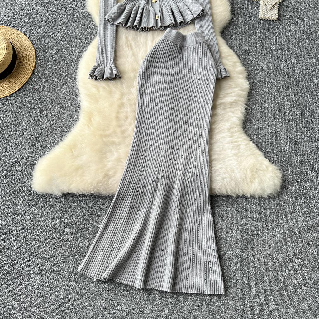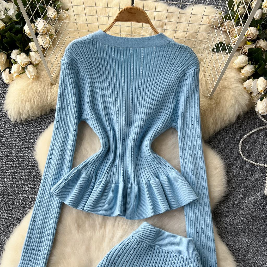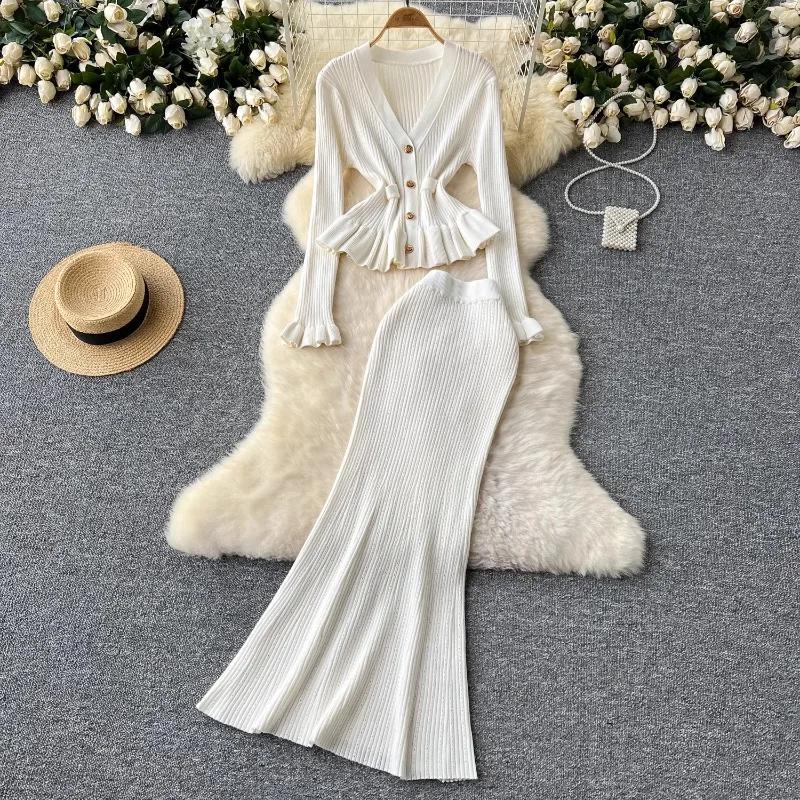 Корейские комплекты из двух предметов, женские наряды, туника с длинным рукавом, укороченный кардиган, облегающая туника с высокой талией, юбка, костюм, модный трикотажный комплект