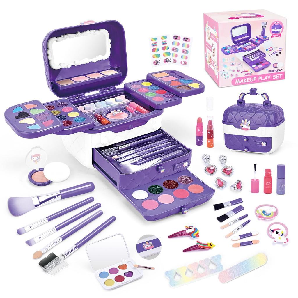 [Набор из 72 предметов, в котором есть все! ] Этот богатый детский набор косметики включает в себя тени для век (17 видов блесток, 14 цветов матовых теней, 6 цветов портативной палитры), блеск для губ, румяна, помада, кисточка для макияжа, лак для ногтей, наклейки для ногтей, пилочка для ногтей, зеркало, заколка для волос в виде единорога и резинка для волос, 2 пары сережек и зеркало для макияжа. Лучший набор косметики, который удовлетворит разнообразные потребности детей в декоре! [Удобный интегрированный футляр для хранения] Этот набор помещен в красивый интегрированный футляр для хранения, который позволяет хранить всю вашу косметику в упорядоченном виде.. Дети могут достать его в любое время, он не занимает много места в закрытом виде и защищен от пыли, поэтому его можно содержать в чистоте.. Поставляется с ручкой для удобной переноски, что делает его идеальным подарком.. Идеально подходит для дней рождения, Рождества и любого другого случая.. [Нетоксичные материалы для вашего спокойствия и легко смываются водой] Вся продукция изготовлена из нетоксичных и безопасных материалов и соответствует международным стандартам производства.. Он безопасен для детей и не вызывает раздражения кожи, поскольку косметику можно легко смыть водой и мылом.. [Развитие эстетического чувства и социальных навыков] Используя этот набор косметики, дети могут развить собственное эстетическое чувство.