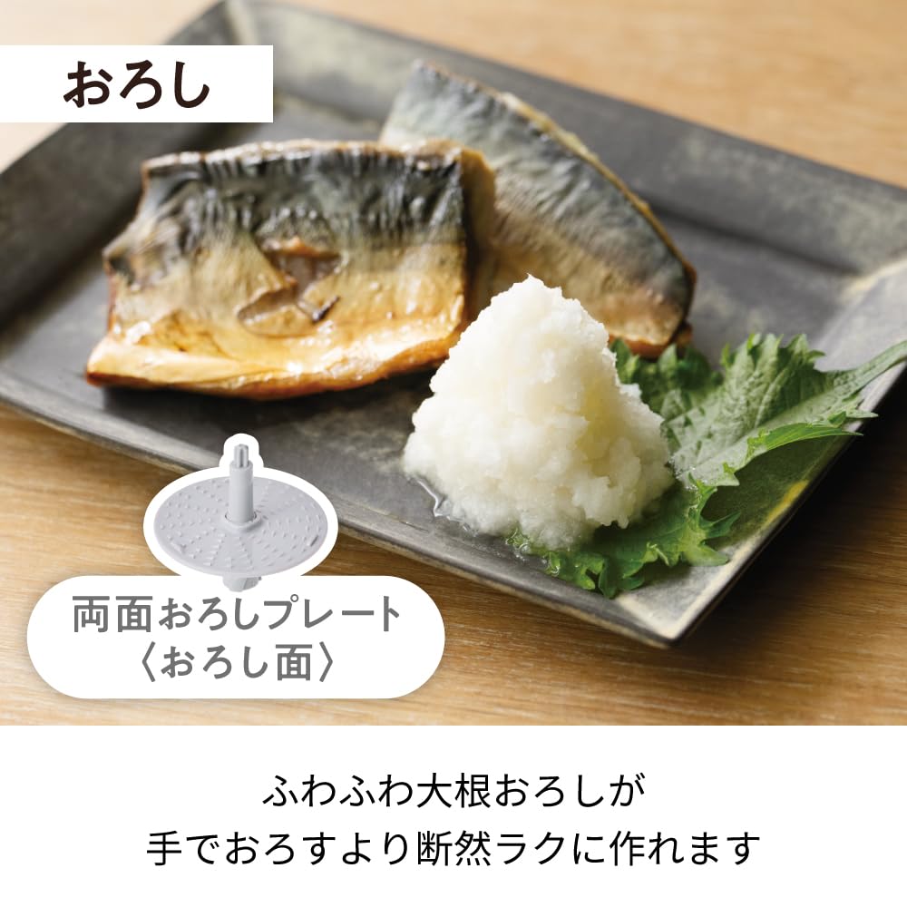 Решётчатая пластина двухсторонняя Решётчатая пластина двухсторонняя с разной шероховатостью решётки на лицевой и тыльной сторонах. На хрустящую тертую редиску уходит около 5 секунд, а на пушистую тертую редьку дайкон — около 30 секунд, что намного проще, чем натирать ее вручную и готовить в большом количестве.. ◆Тарелка для освежения. Делает свежие сливки воздушными примерно за 30 секунд*. Так как вы можете взбивать без использования миски, брызг не будет.. *При взбивании свежих сливок (200мл) с содержанием жира в молоке 35% ◆ Все, что находится за основным корпусом, можно мыть водой. Вы также можете снять прокладку крышки, которая может испачкаться, и вымыть ее начисто.. Чашка имеет широкое горлышко, ее легко чистить и обслуживать.. ◆ В комплект входит специальная книга рецептов с большим выбором рецептов. В общей сложности содержит 32 рецепта, включая изысканные гамбургеры, рубленые салаты и джелато, приготовленные под руководством Джуна Эды, популярного повара, который появляется в журналах и на телевидении.