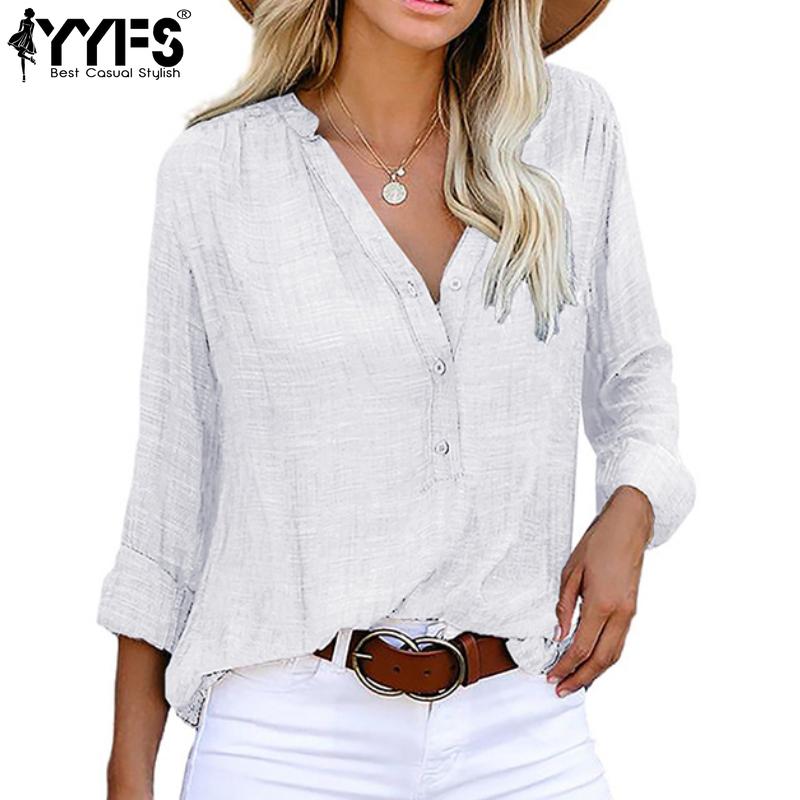 YYFS Женские модные повседневные весенне-осенние однотонные блузки и рубашки с v-образным вырезом и длинным рукавом с принтом