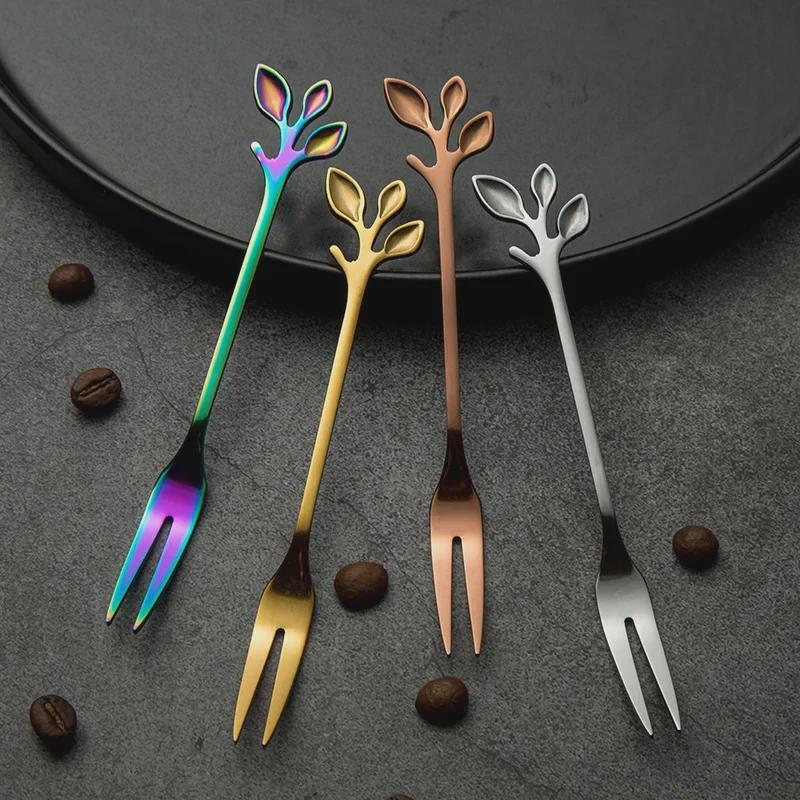 Набор ложек и вилок из нержавеющей стали Golden Leaf — маленькая кофейная, для помешивания, десертная ложка с креативной фруктовой вилкой