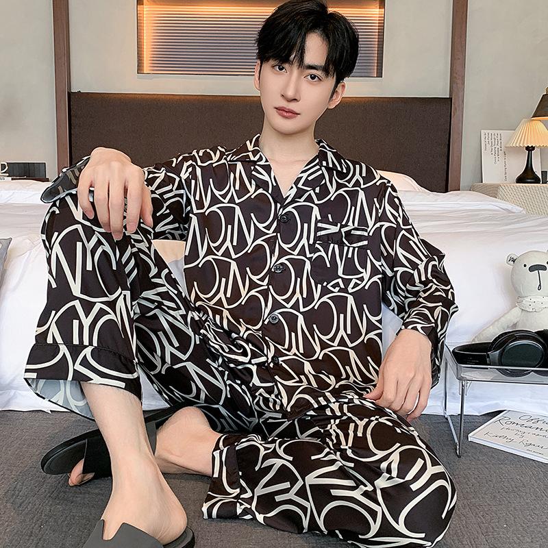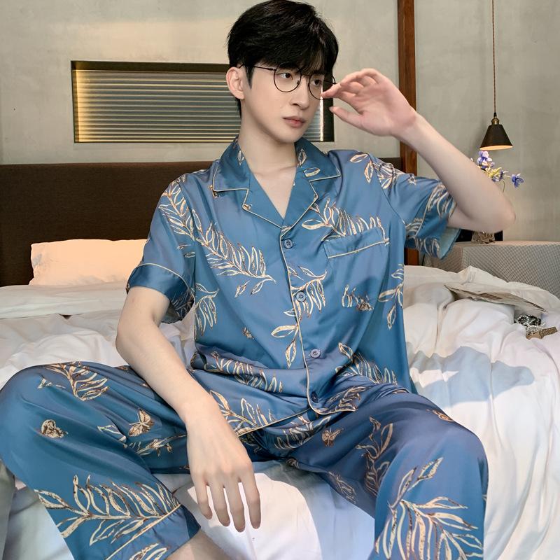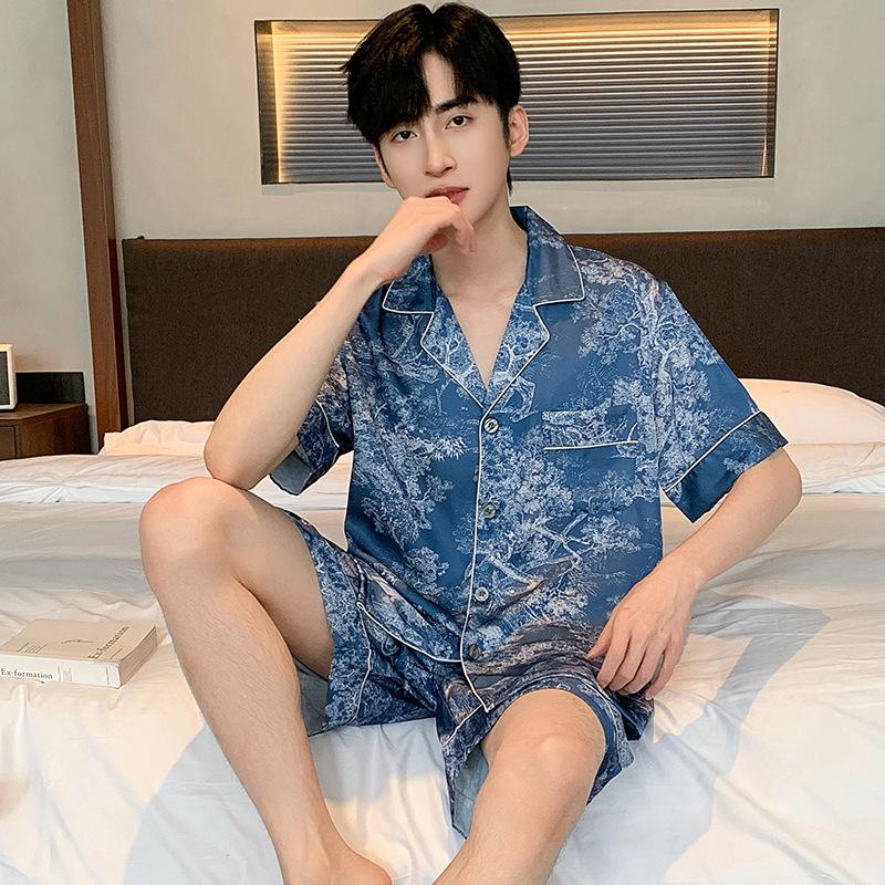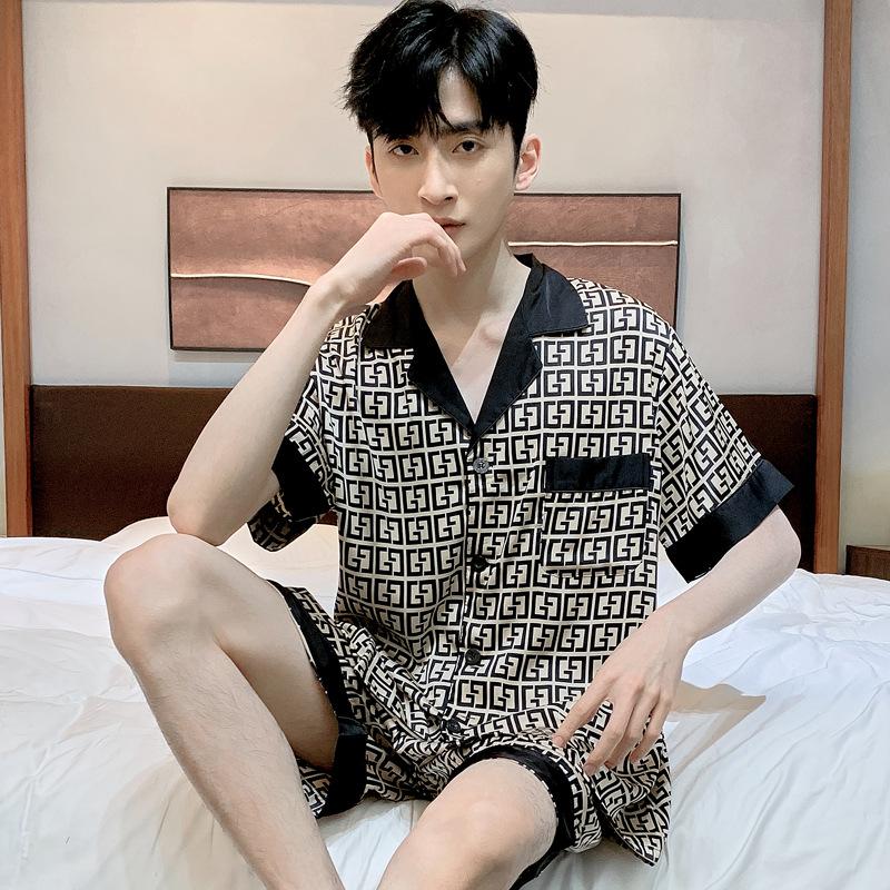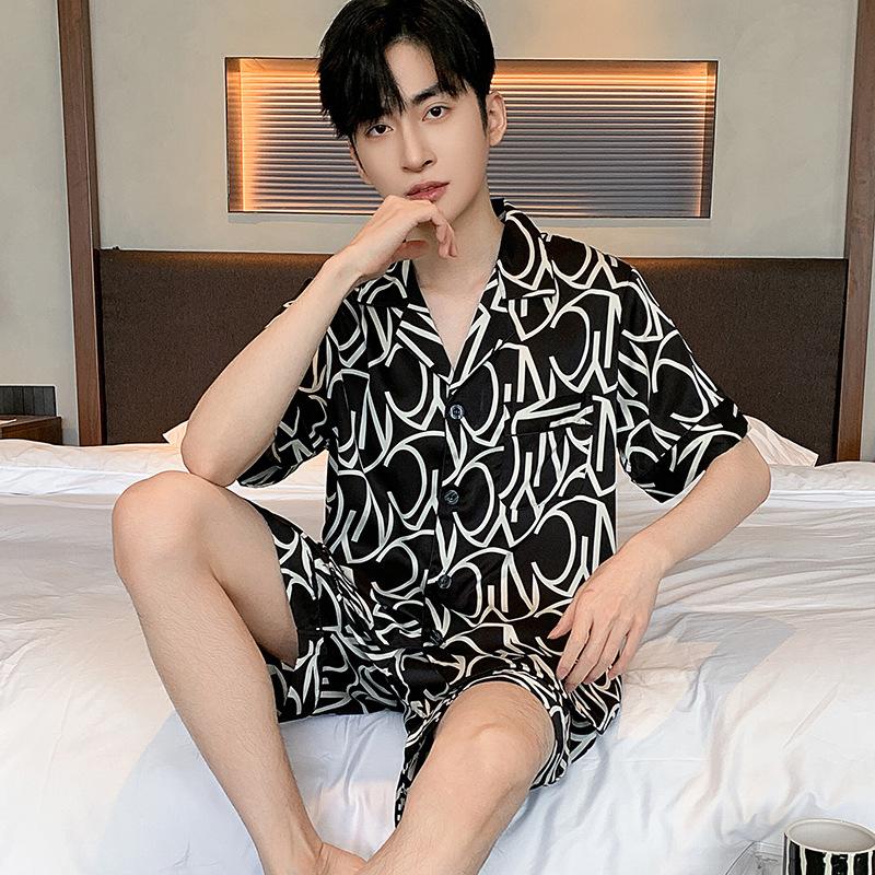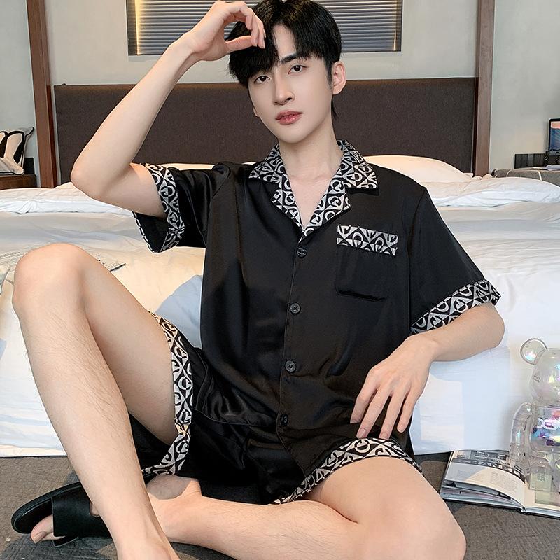 Пижамный костюм из ледяного шелка для мужчин, весна-лето, модная одежда для отдыха с коротким рукавом из полиэстера, мужская одежда для сна, домашняя одежда для мужчин