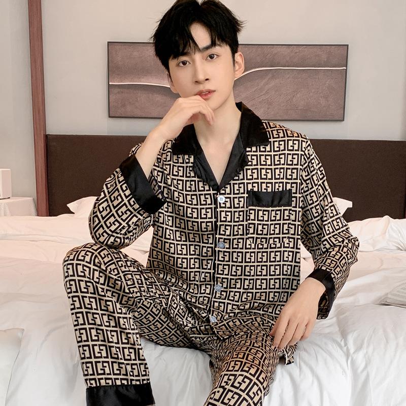 Пижама мужская весна-лето тонкий ледяной шелк роскошный свободный покрой домашний костюм мужской атласный пижамный комплект ночной костюм для джентльменов