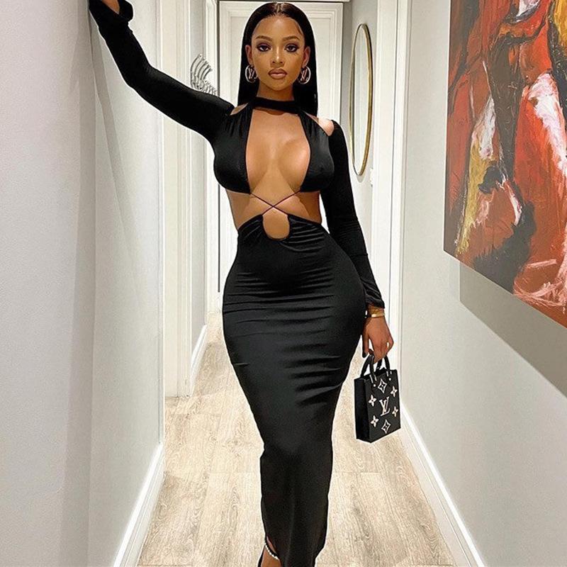 Сексуальное платье макси с крестообразным вырезом и открытыми плечами, женское однотонное платье с открытой спиной и длинными рукавами, хипстерское вечернее платье, женское облегающее уличное платье