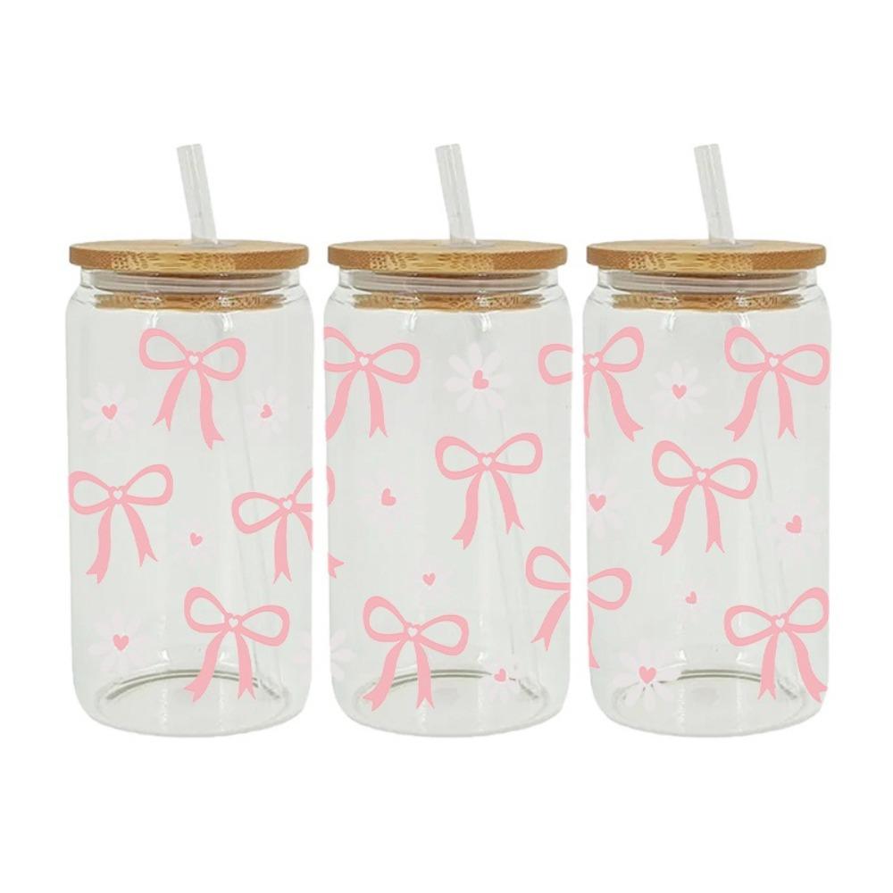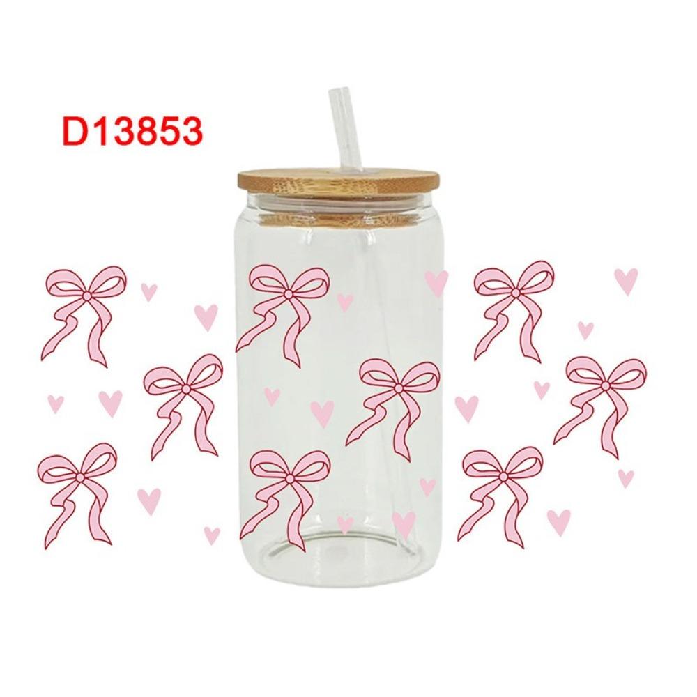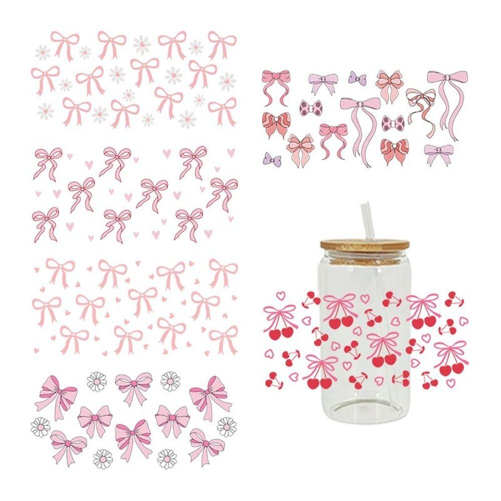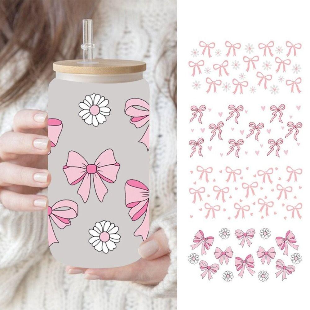 Waterproof Wrap Stickers Clear Pink Bow Decals Diy UV DTF Transfer Sticker For 16Oz Glass Cup