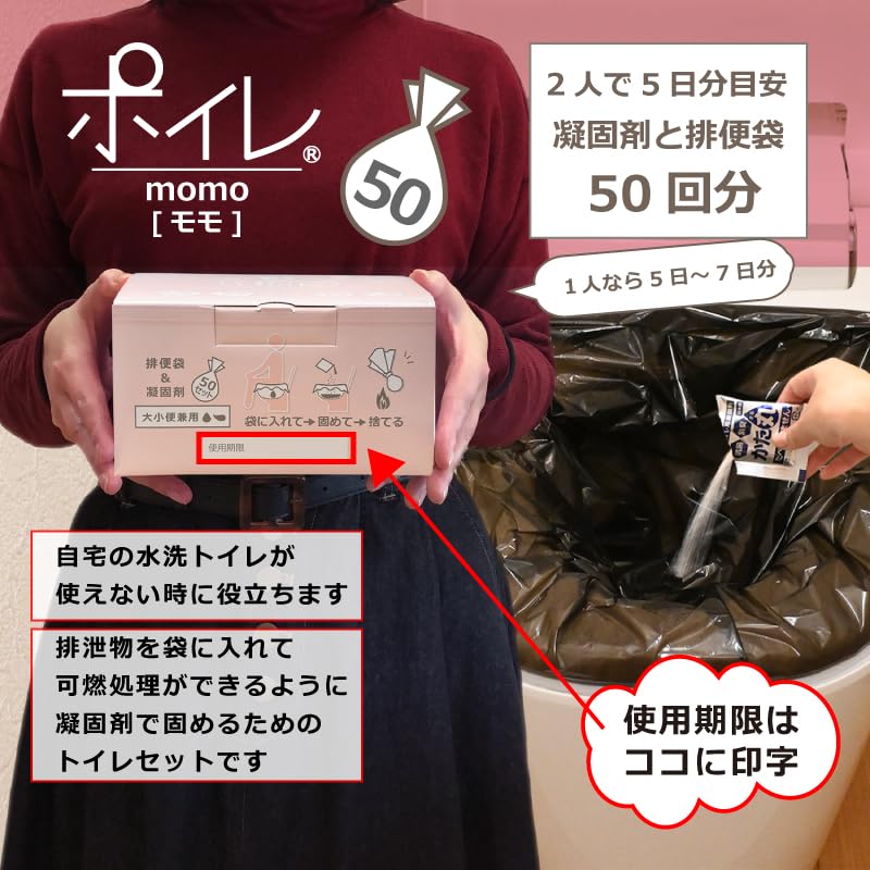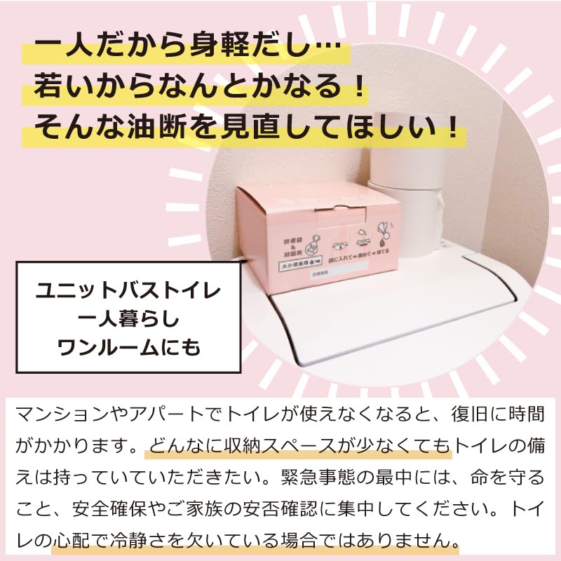 [Характеристики] Это простой аварийный туалетный набор, который можно использовать для 50 мочеиспусканий и дефекаций без использования воды. (этот продукт не имеет индивидуальной упаковки). Рекомендуется запастись запасами на одну неделю для одного человека или на четыре дня для двух человек, а также в качестве экстренного запаса на случай отключения воды, отключения электроэнергии, пробок на дорогах и стихийных бедствий.. Поскольку в нем используется коагулянт, обладающий превосходными дезодорирующими и антибактериальными свойствами, его также используют в переносных туалетах для ухода за больными.. (Цвет упаковки может немного отличаться от того, что вы видите на мониторе, и фактического продукта.. Логотип и т.д.. напечатаны белым и серым цветом на светло-розовом фоне.)